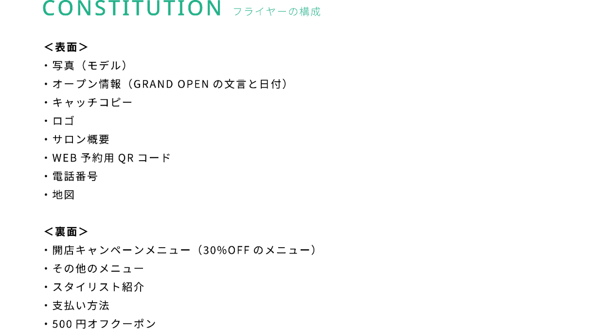 →詳細のキャンペーン情報はあえて載せず、裏面に目を通してもらう - 裏面:キャンペーン情報+スタッフ