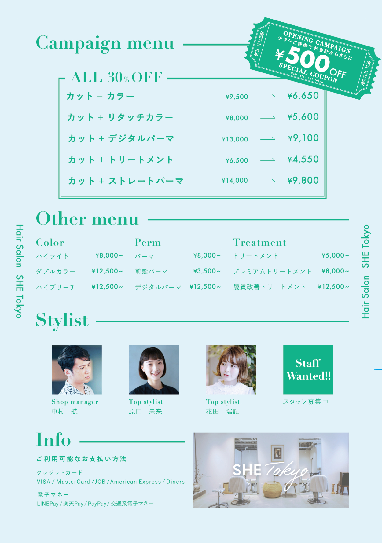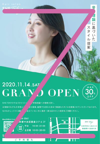 SHElikes MULTI CREATOR PROJECTにて、美容室オープンのフライヤー制作課題に取り組みました。(制作時間:18時間)
