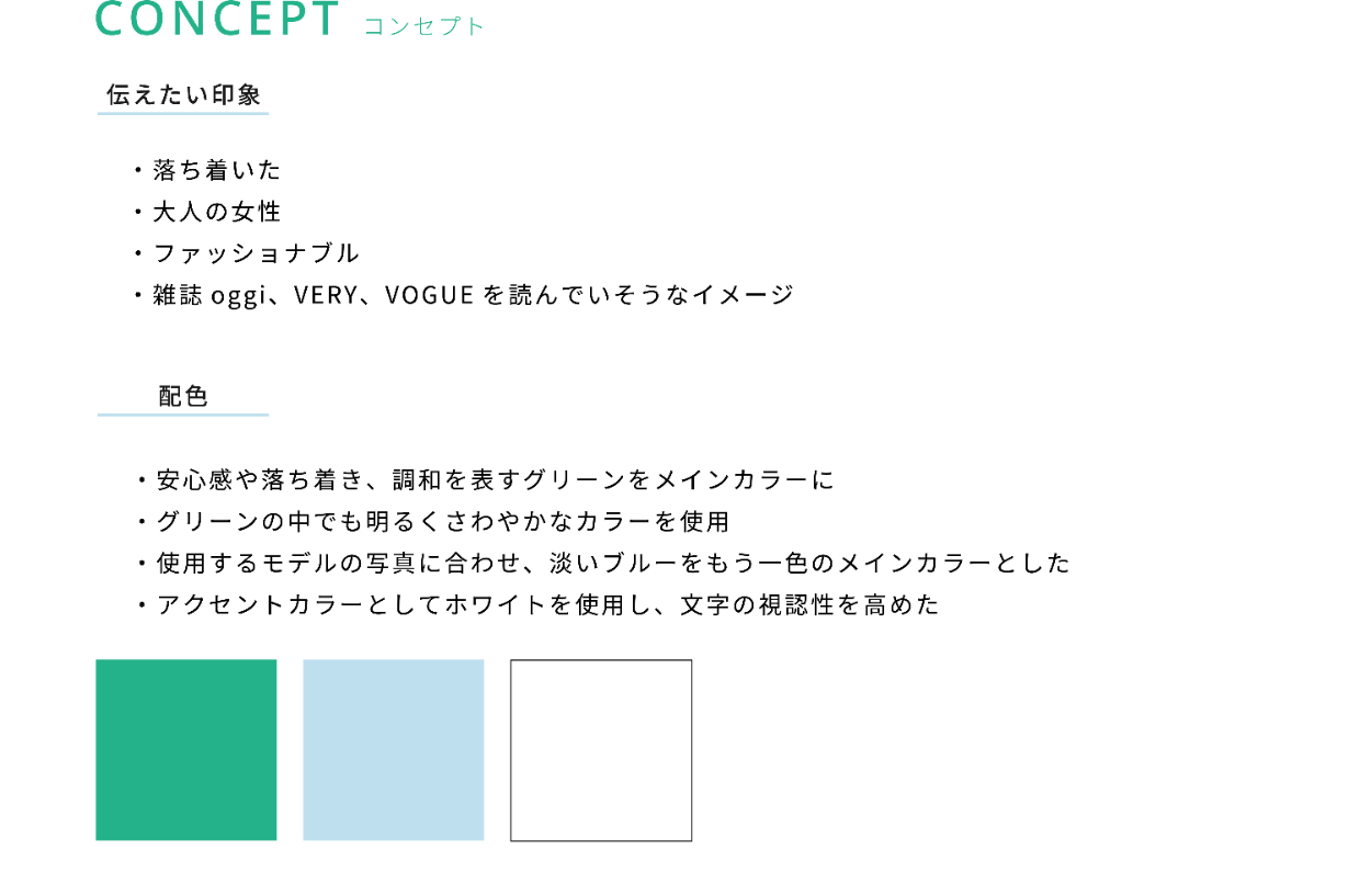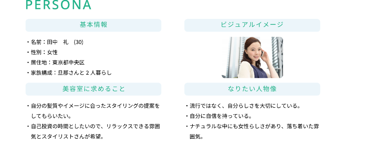 - 流行を取り入れるよりかは、お客さまに似合うことを重視しているクライアントであり、それにマッチする価値観や思考をもつペルソナ設定にしました。
