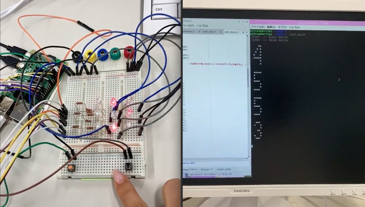 右のタクトスイッチを押すとランダムに1から6の出目が点灯しターミナルにも出目を表示。再度押すと同様の動作を繰り返す。