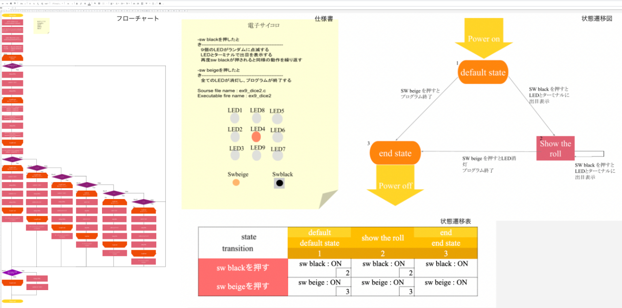 スイッチを押した後にすぐ出目を表示するのではなく、全てのLEDがランダムに点灯する工程を作ることで実際のサイコロを転がしている時間を表現しました。ランダムの点灯は乱数を2つ用意し30msごとに点滅させました。