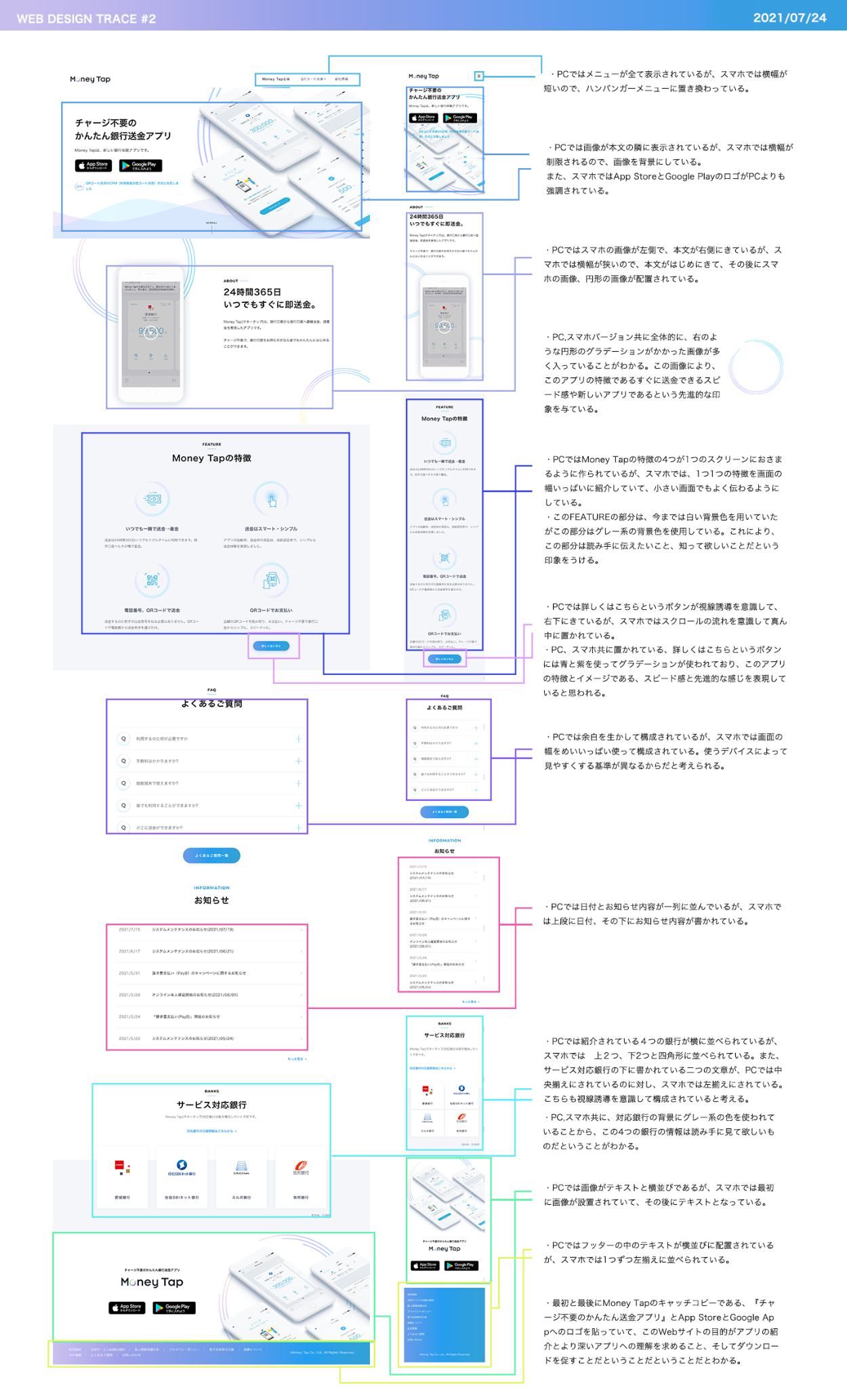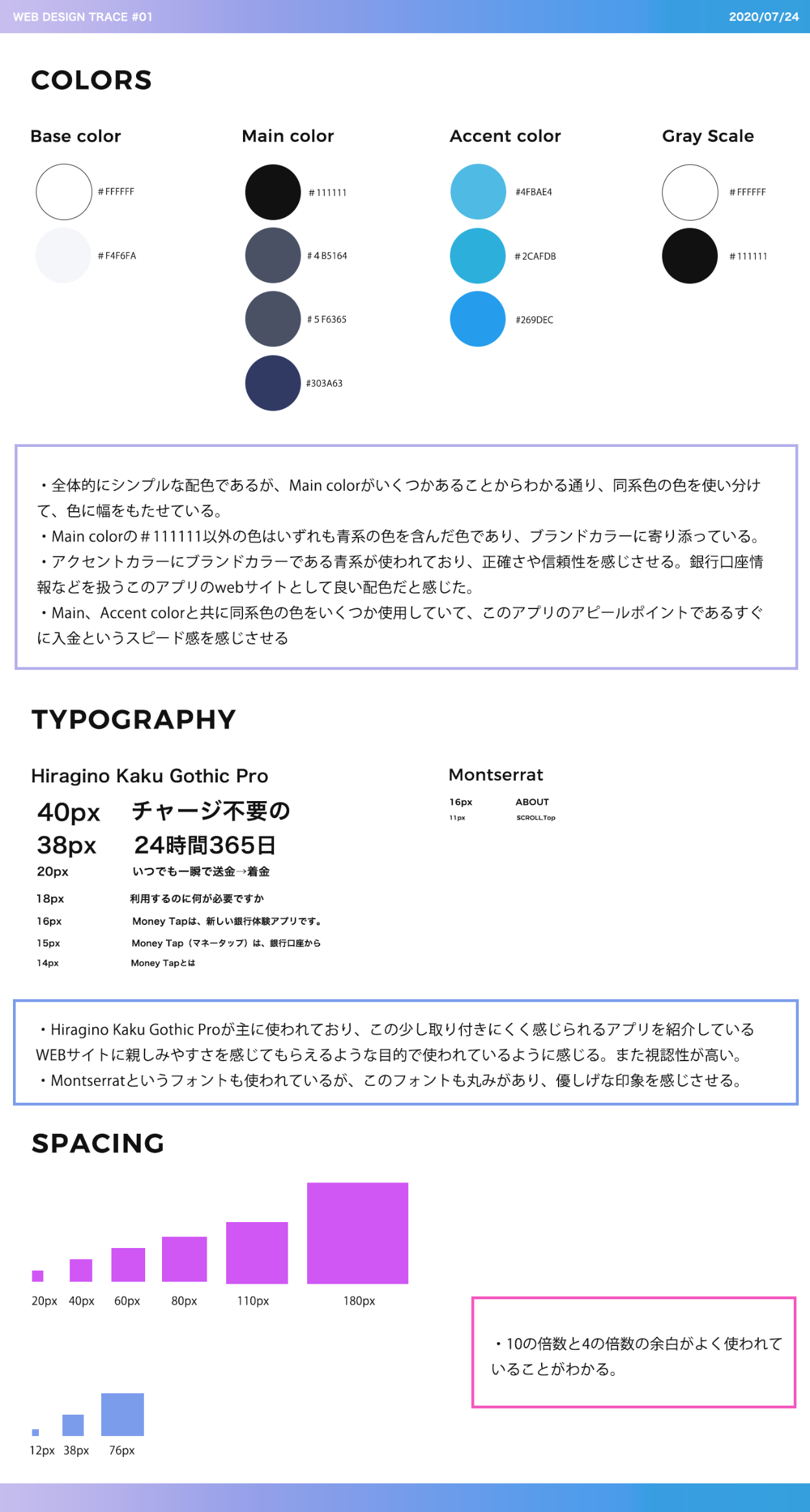 SHE likes MULTI CREATOR COURSEの3つ目の課題です。Money TapのWEBページのトレース、スタイルガイドの作成を行い、PCとスマホのデザインの比較、分析をまとめました。(制作時間 35時間)