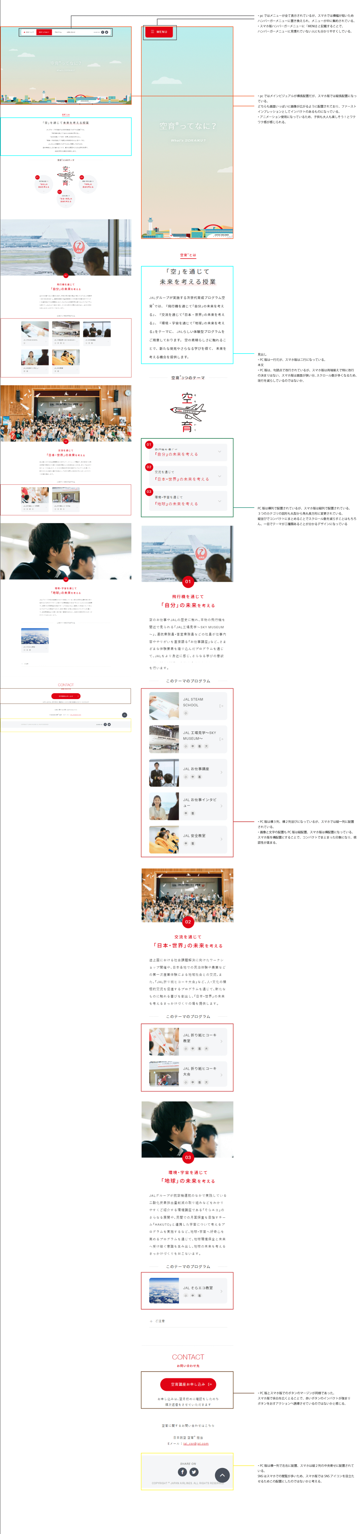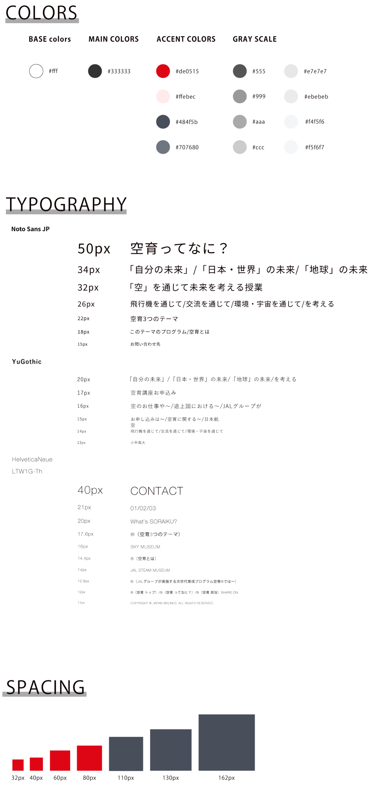 このページでは無彩色の白、黒、グレー(グレーに近い青も含む)以外はほぼJALのアイコンカラーである赤のみの配色になっている。一見色味が乏しく思えるが、グレーの中で異なる明度を使うことによって、メリハリ・奥行き感・まとまり感を出すことができることがわかり、また色味が少ないため全体としてスッキリした印象になることが分かった。