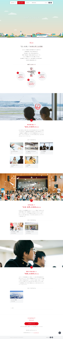 大手航空会社のサイトということで、トンマナや企業のイメージを保ちつつ、お子さんや教育関係の方にも抵抗なくみてもらえるように、角丸四角形や円、薄いトーン、メインビジュアルのイラストなど、かっちりとしつつ優しいデザインになっていると感じた。LP内の画像も小学生から高校生のこどもがメインで写っているものが多く、自社としてこどもたちの未来に何ができるのか?ということがよりしっかりと伝わるLPになっていると思った。