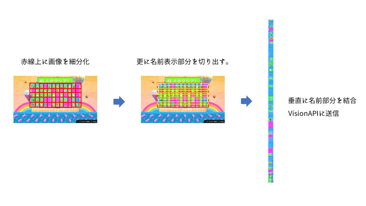 Cloud Vision APIはGoogleが提供するクラウドOCRである。画像を引数として渡す事で、画像に内在する文字列を戻り値として取得する事ができる。Googleのサーバと通信する必要がある為、以下の様にPILライブラリで画像を切り出し、一枚の画像として送信する事で通信回数を削減している。