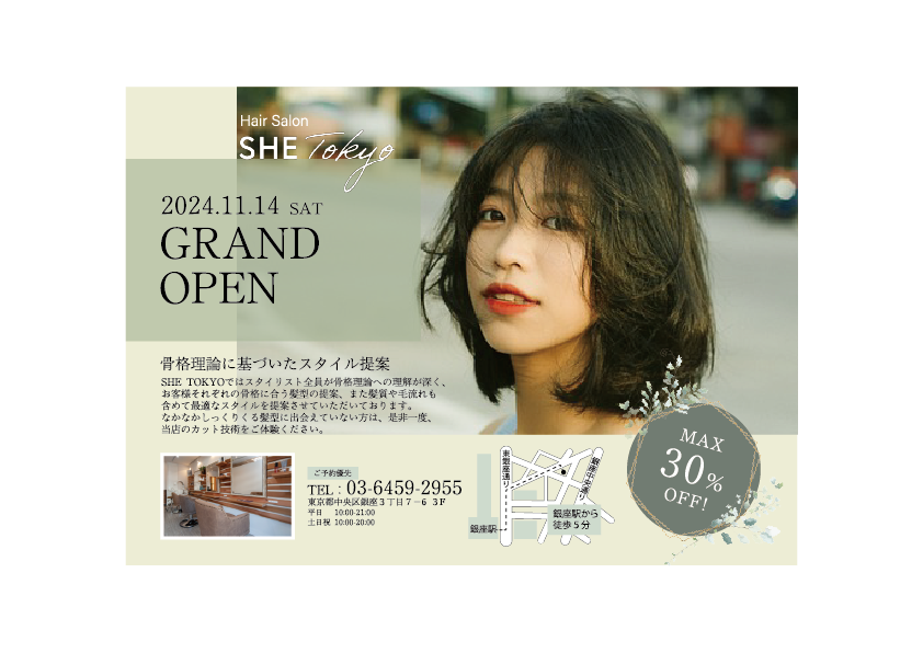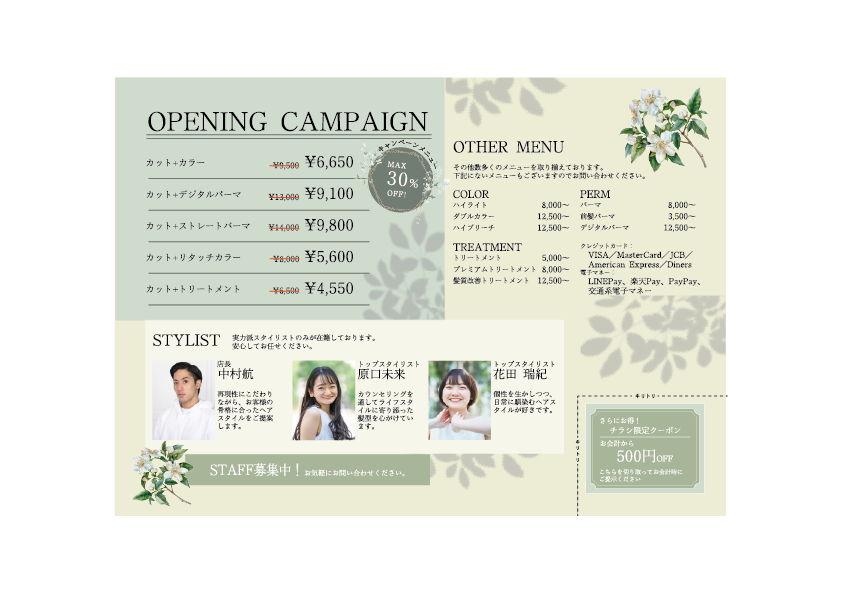 SHElikes MULTI CREATOR COURSEの課題で、骨格理論に基いたスタイル提案が売りの美容室の特別キャンペーンフライヤー制作に取組みました。