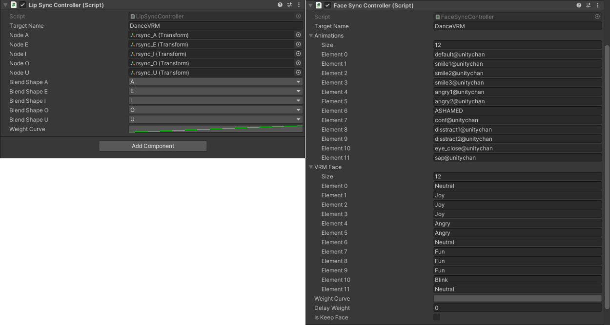 そのため、リップシンクの変換用のスクリプト「LipSyncController」と表情の変換用スクリプト「FaceSyncController」を用意することで、解決しました。
