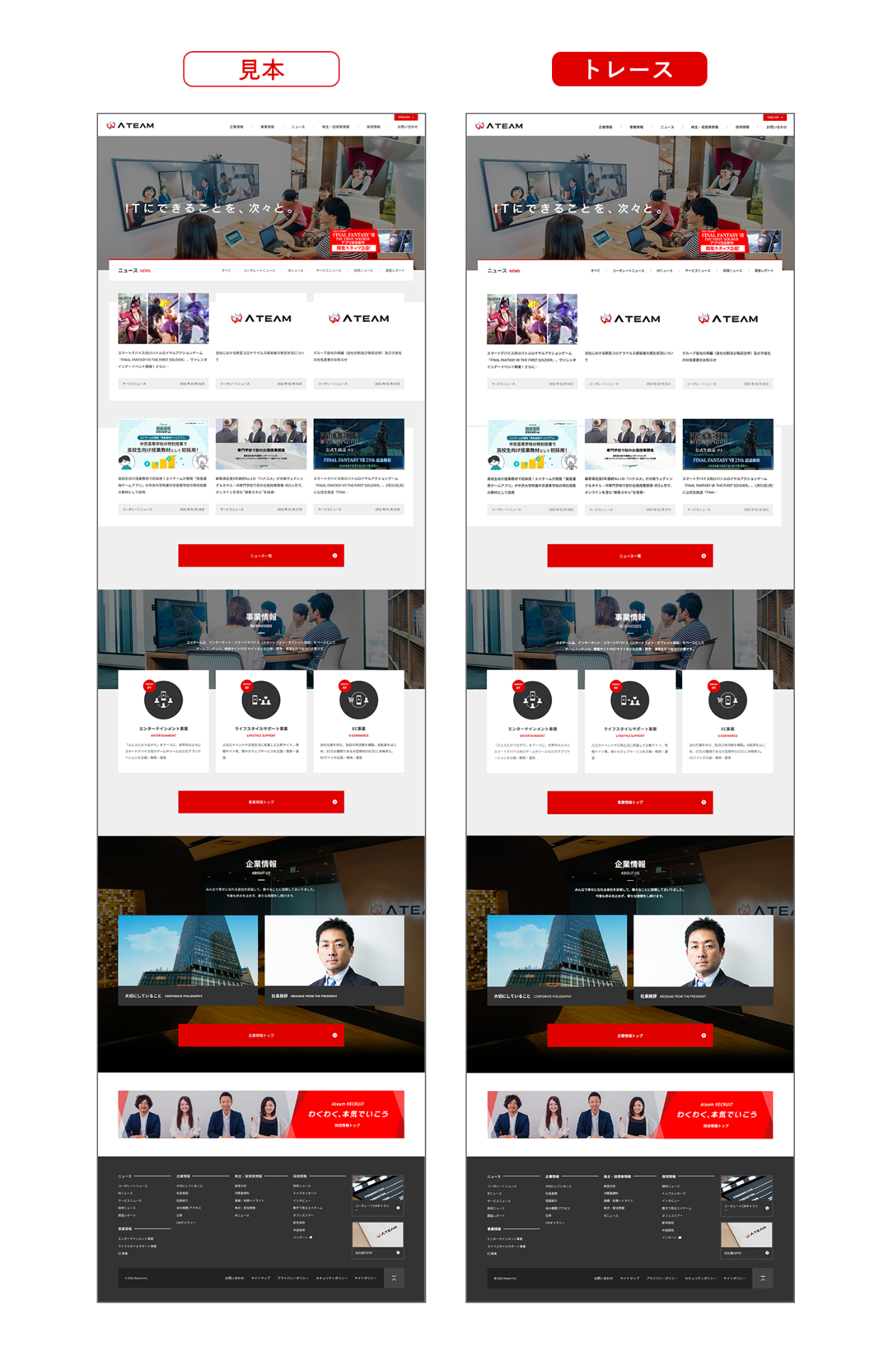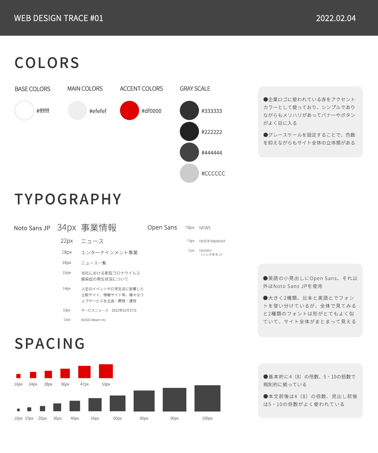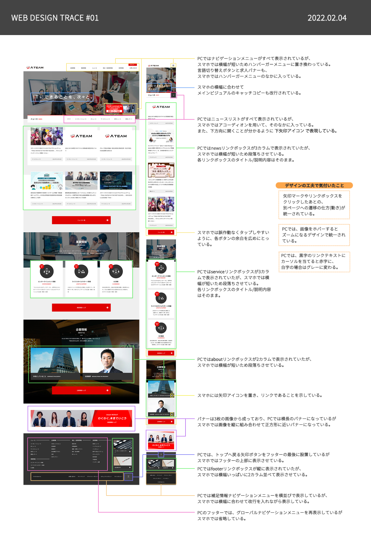 SHElikes MULTI CREATOR COURSE 課題4つ目で、LPトレースに取り組みました。基本のレイアウトを学べるサイトを見本に選び、レスポンシブデザインの観察・分析、スタイルガイドについてもまとめています。※引用元:https://www.a-tm.co.jp/