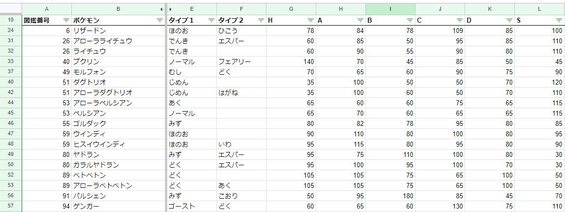以下はキャラクター名と各キャラクターに関する数値をcsv形式で保存した結果です。