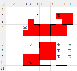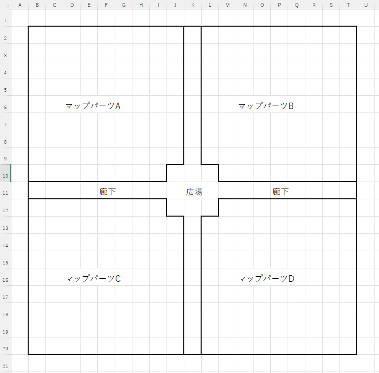 このようにExcelシートで作った小さなダンジョンの地図を4枚組み合わせて、