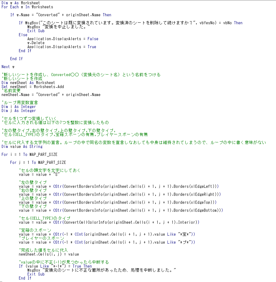 2.地図を書いたシートに対してVBAマクロを使用し、シート内の情報をすべてテキストに変換し、csvファイルとして保存