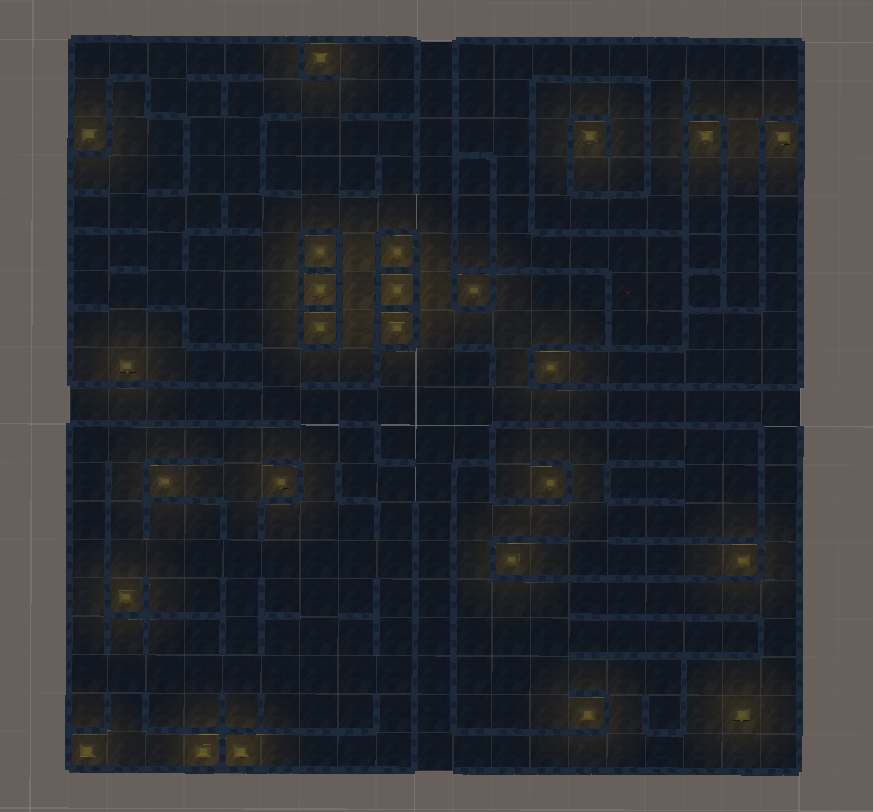 - 広場と廊下を除いた((n - 1) / 2) × ((n - 1) / 2)マスの大きさのプリセット(マップパーツ)が数十種類存在し、これをランダムに4つ抽選して組み合わせることでマップを生成する。
