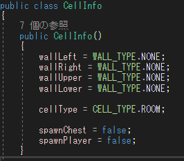Unity側でダンジョンの「1マス」を表現するためのクラスです。現在の仕様では1マスの情報をすべて表すには7つの変数が必要であり、これに合わせてExcel側のVBAマクロを組んでいます。