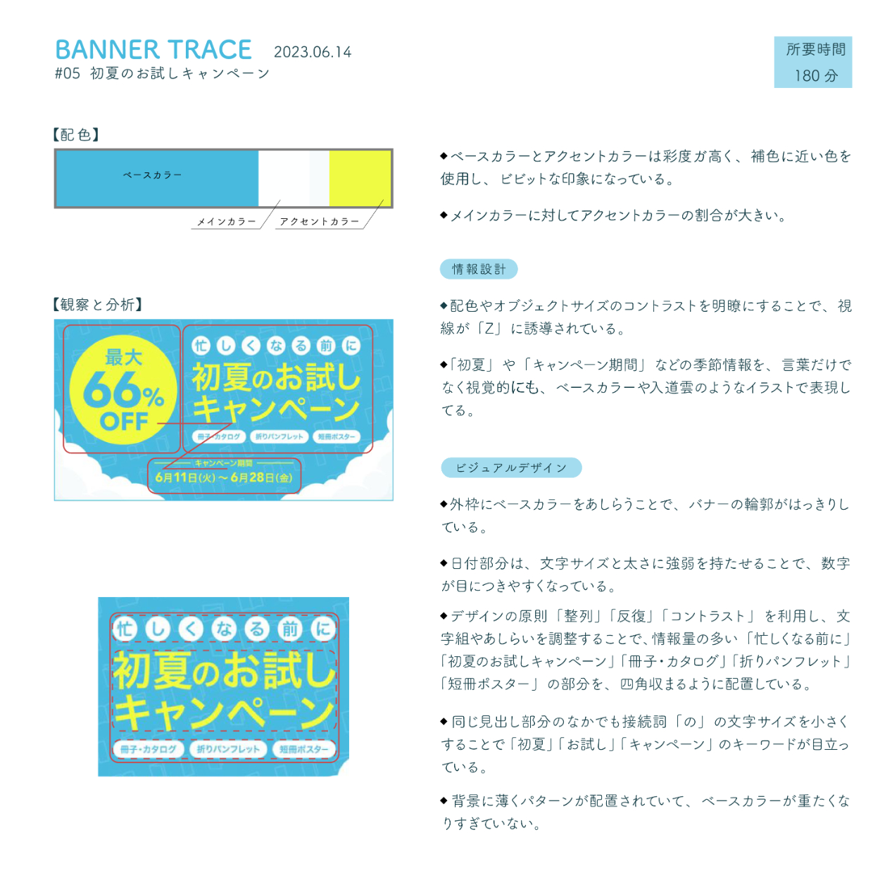 配色や文字組の分析を頑張りました。ベースカラーとアクセントカラーが補色に近い色を選定しており、情報に優先度が色でも表現されていることが分かりました。また、文字組については、デザインの4原則「近接」と「整列」が活かされていることに気が付きました。文字サイズや余白をそろえ、あしらいに統一感を持たせることで、情報量が多いグループであっても、視覚的に伝えたいことが正確に伝わるバナーになっていることが分かりました。
