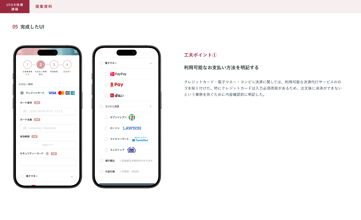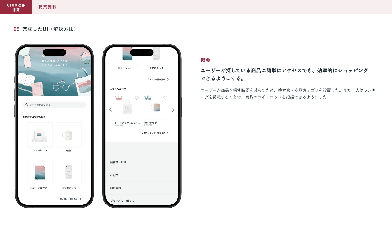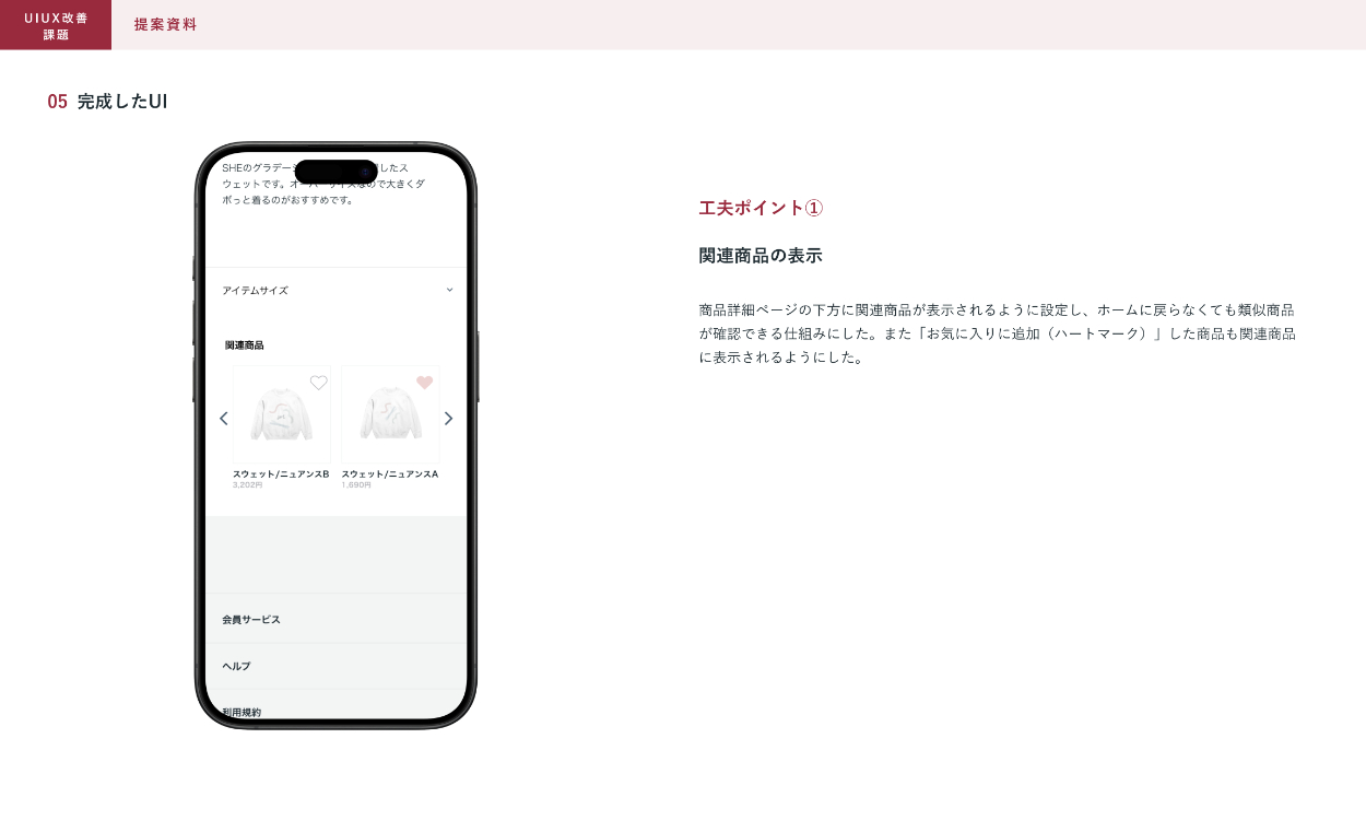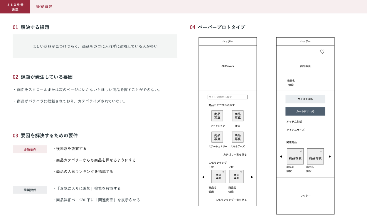 SHElikes MULTI CREATOR COURSE Designerにて、架空のECサイトのUI/UX改善を行いました。Figmaを使用したデザインカンプの修正、ペーパープロトタイプ・改善提案資料を作成しました。
