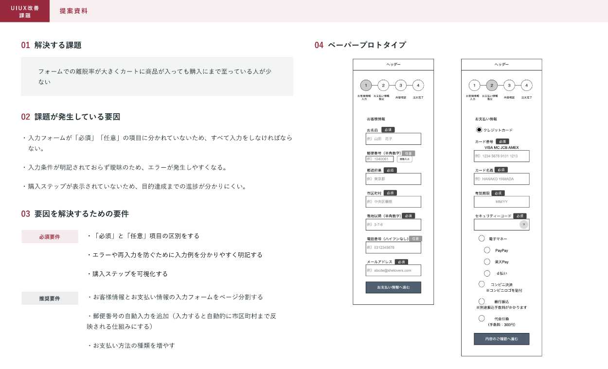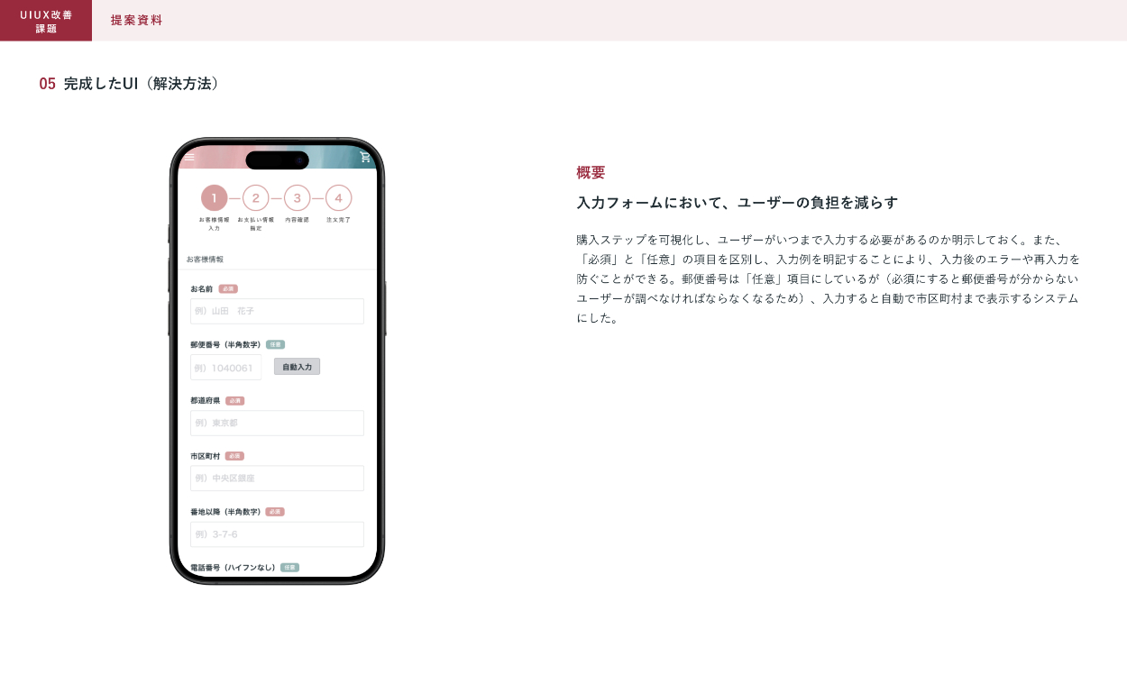 ユーザー目線になって課題が発生している要因を考え、解決策の提案方法を学ぶことができました。UI UXの言葉は聞いたことありましたが、内容に関しては無知だったので、学びの多い課題でした。