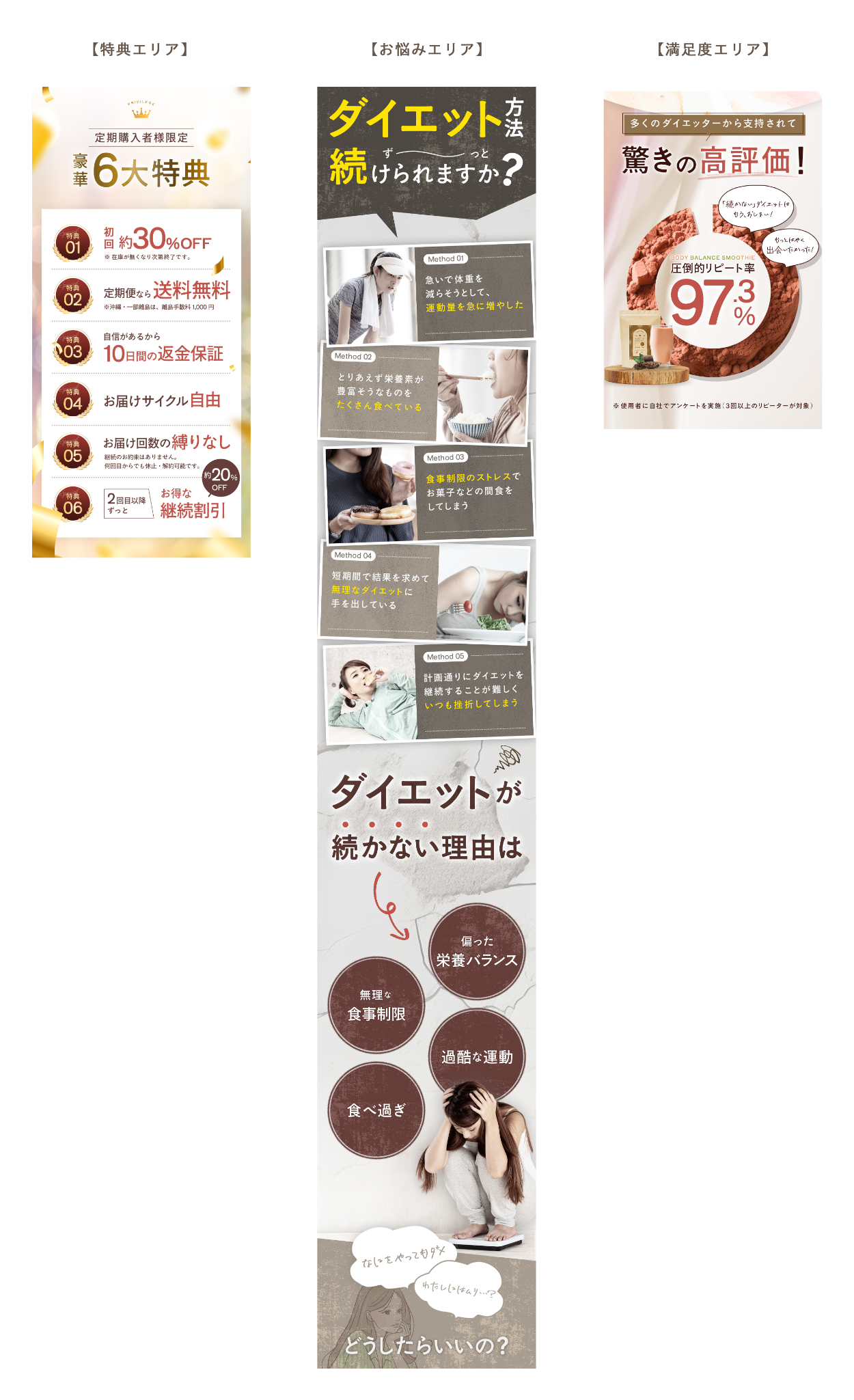 - 「そのダイエット方法ずっと続けられますか?」とユーザーをあおり、ダイエットが続かない理由を明確に提示
