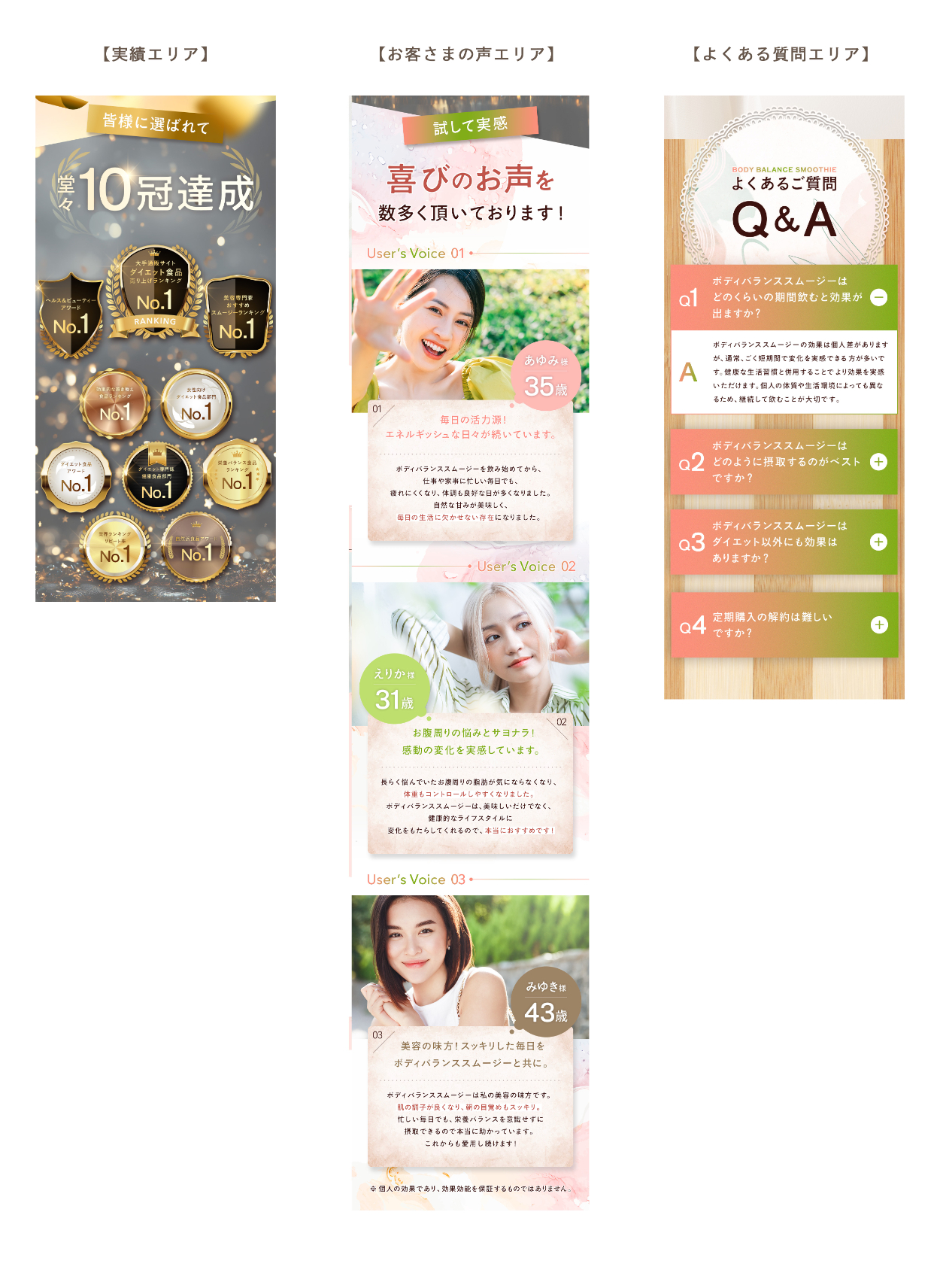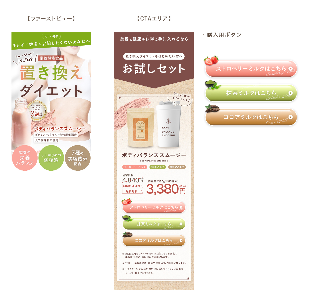 「ダイエットスムージー」を商材とした架空LPを制作いたしました。 ※ 画像内全て架空の内容です。