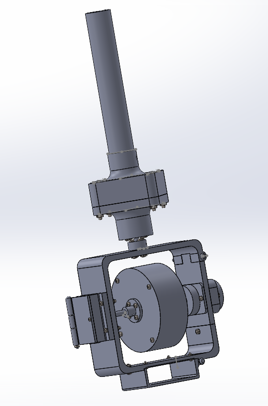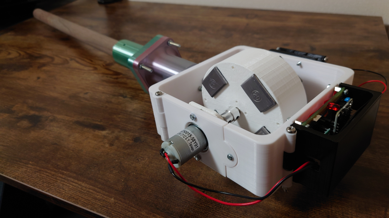 3DCAD上で設計したデバイスの全体像と実際の写真は以下の通りです。上部の棒状の部分が体験者が握る部分であり、下部のジンバルと円板が回転することでジャイロ効果が発生し、意図的に力を生み出すことができます。