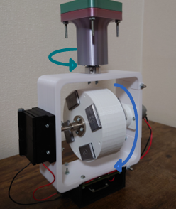 白いジンバルは緑の矢印の方向に回転し、内部の白い円板は青い矢印の方向に回転します。円板の円周付近が重いほど回転時の力が大きくなるため、円周付近におもりを固定することでなるべく大きい力が発生できる工夫を施しました。