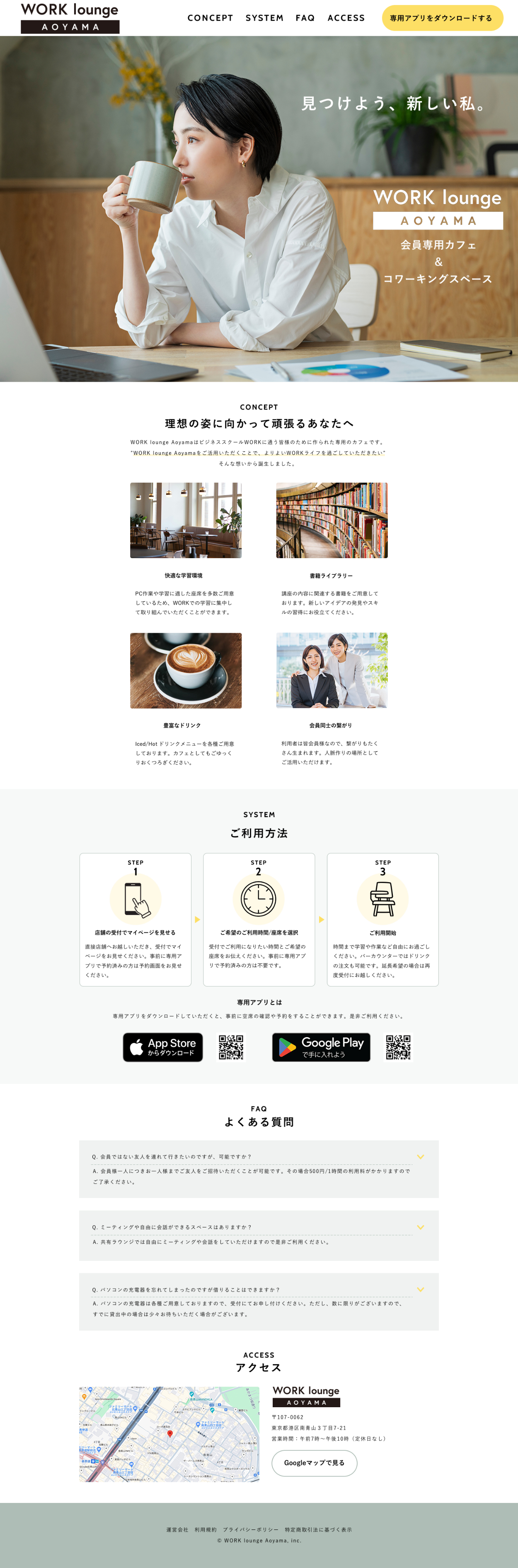 東京という大都会の中で、都会のオアシスとも言える青山。おしゃれなお店がひしめく中、自分らしい時間を過ごせる場所がある。待ち時間もなく、すぐに入店できる。緑が多く落ち着いた店内では、集中して作業に没頭できる。店内にあった本を読んでみたら、新しい自分の好きなことに出会えた。同じように頑張る仲間を見ていると、前向きなエネルギーが湧いてくる。「理想の姿に向かって頑張るあなた」を応援するための場所として、快適な環境を提供します。