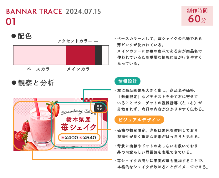 ・バナーの観察・分析から、ターゲットや目的に応じて情報設計とビジュアルデザインを考えていくことの重要性を学びました。