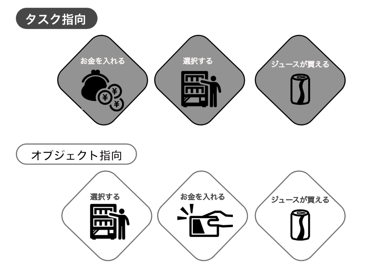 タスク指向の自動販売機は、「旧型自動販売機」に多く、オブジェクト指向の自動販売機は最近よく使われている電子決済機能もついた「新型自動販売機」に多くあります。
