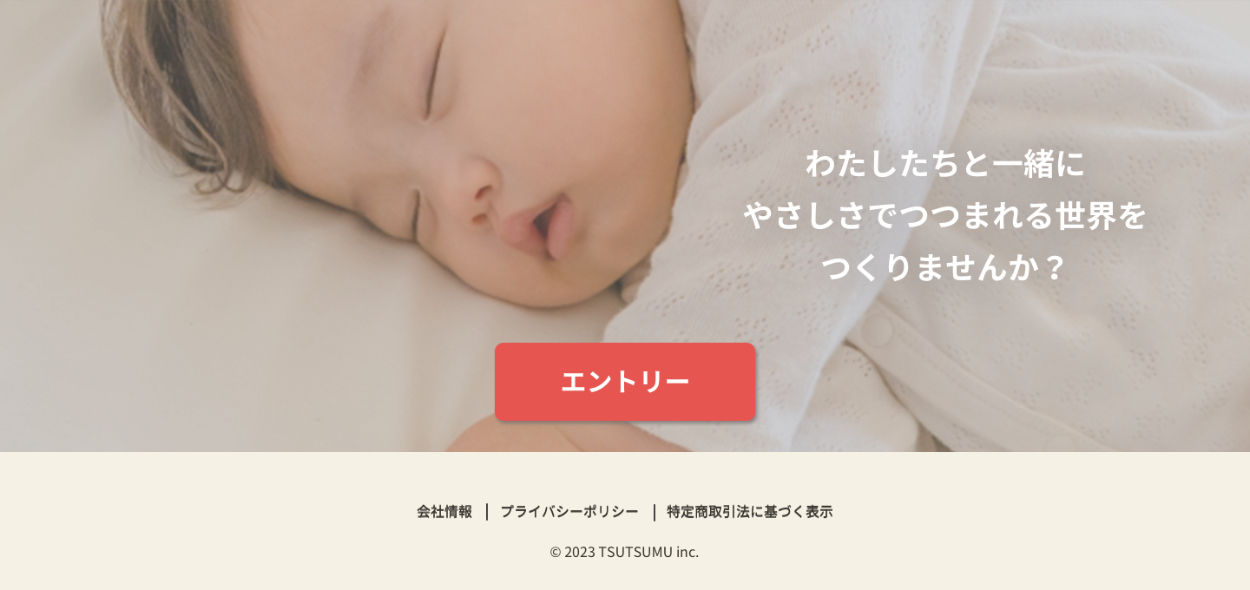 「わたしたちと一緒にやさしさでつつまれる世界をつくりませんか?」という文言とエントリーボタンを設置することで、最後にエントリーの後一押しをしています。