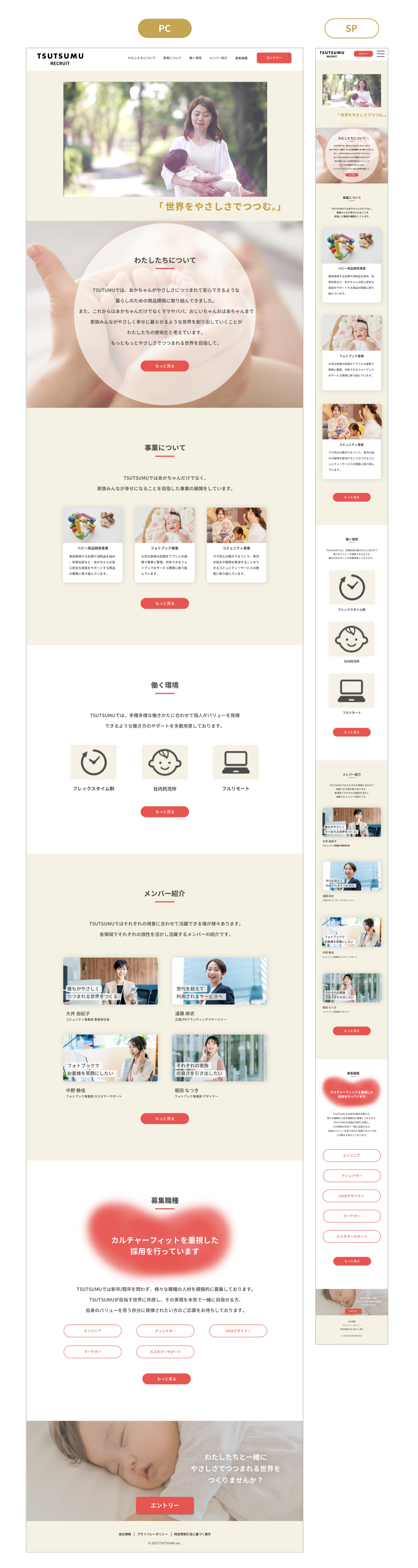 暖かさや温もりです。ベビー用品を扱う会社なので、赤ちゃんの写真を入れたり、トンマナを暖色系でまとめました。転職希望者向けの採用サイトなので、伝えたい箇所が伝わるように色を目立たせて、シンプルなデザインにまとめました。