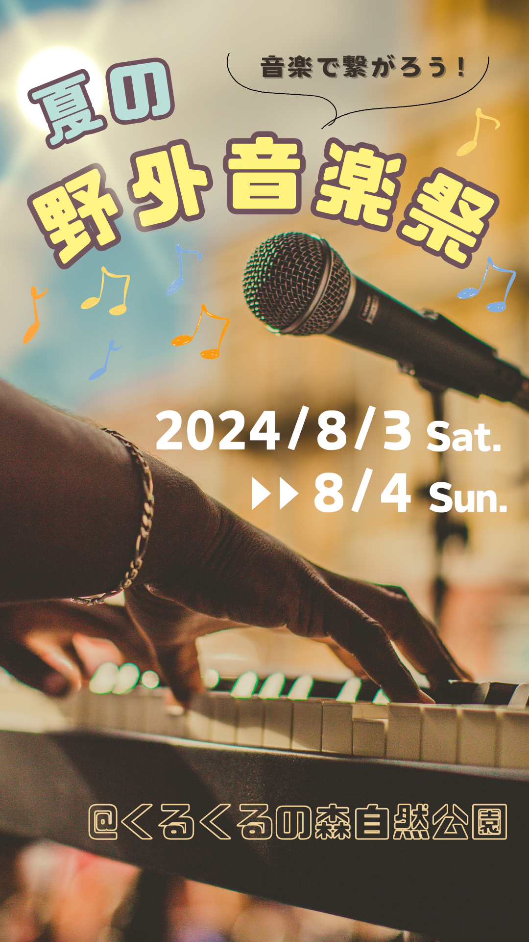 - 背景の画像は一目で音楽のお祭りであることがわかるようにマイクとピアノ、ピアノを弾く手が見えるようにしました。