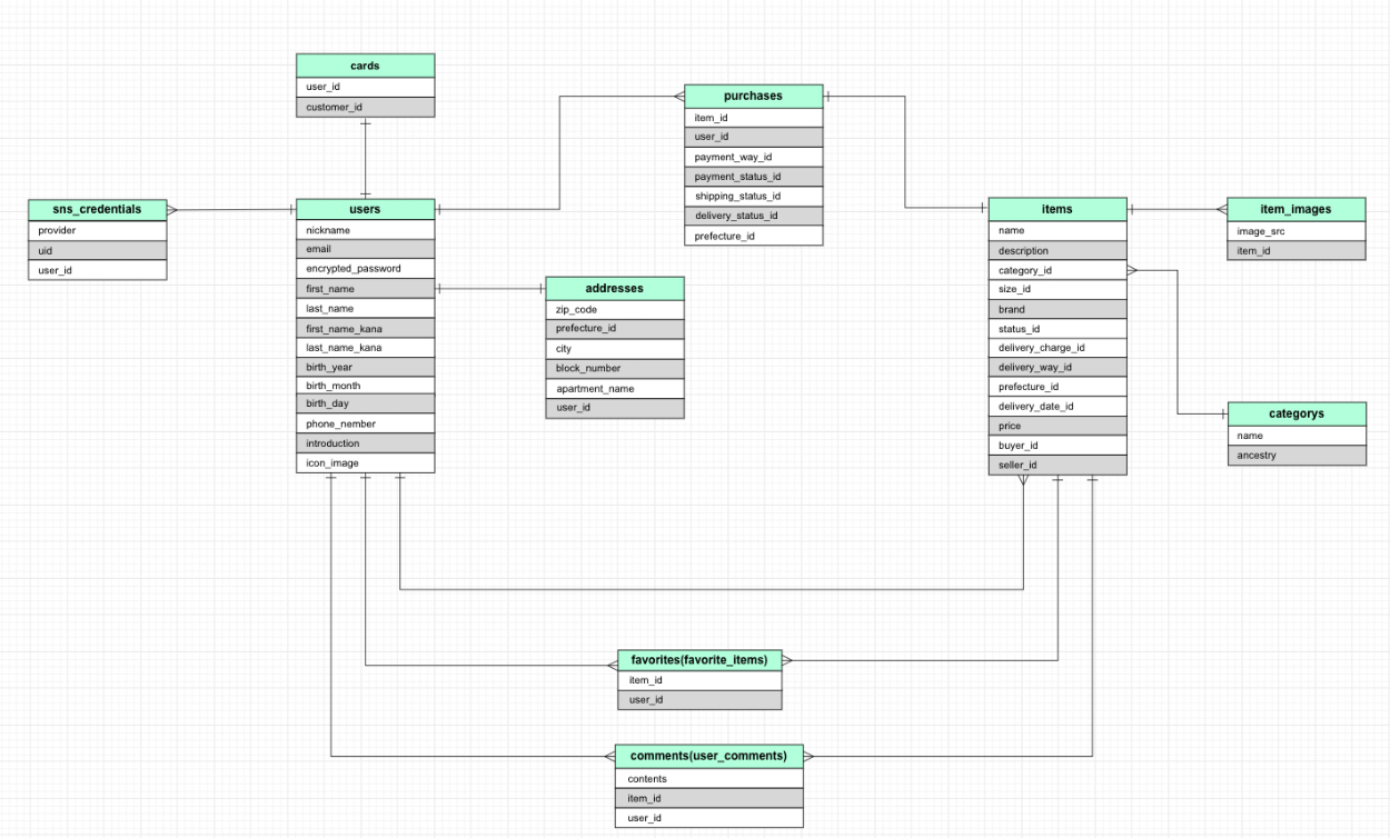 1人のユーザーが商品の出品、購入、さらにコメント、評価ができるという多機能なアプリケーションの開発が私には初めてでした。そのため、どのようなテーブルがあり、テーブル同士がどのような関係性なのかは、イメージしづらく、DB設計に苦労しました。
