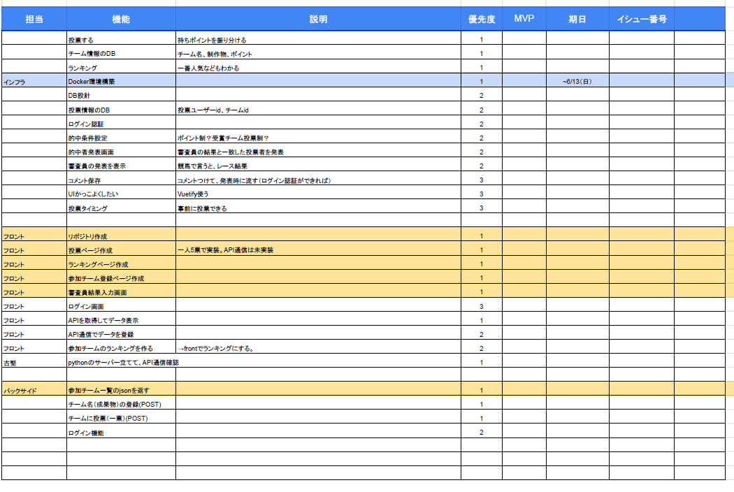こういったスプレッドシートを作ってMVPを決めることで、その作業に注力できたと思う。(最終的にはそのMVPも完璧に実装できなかったが...)