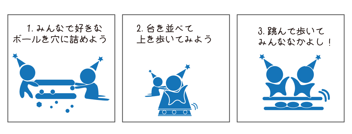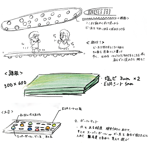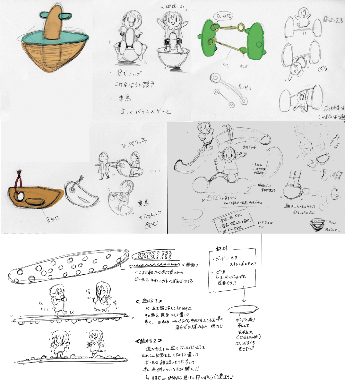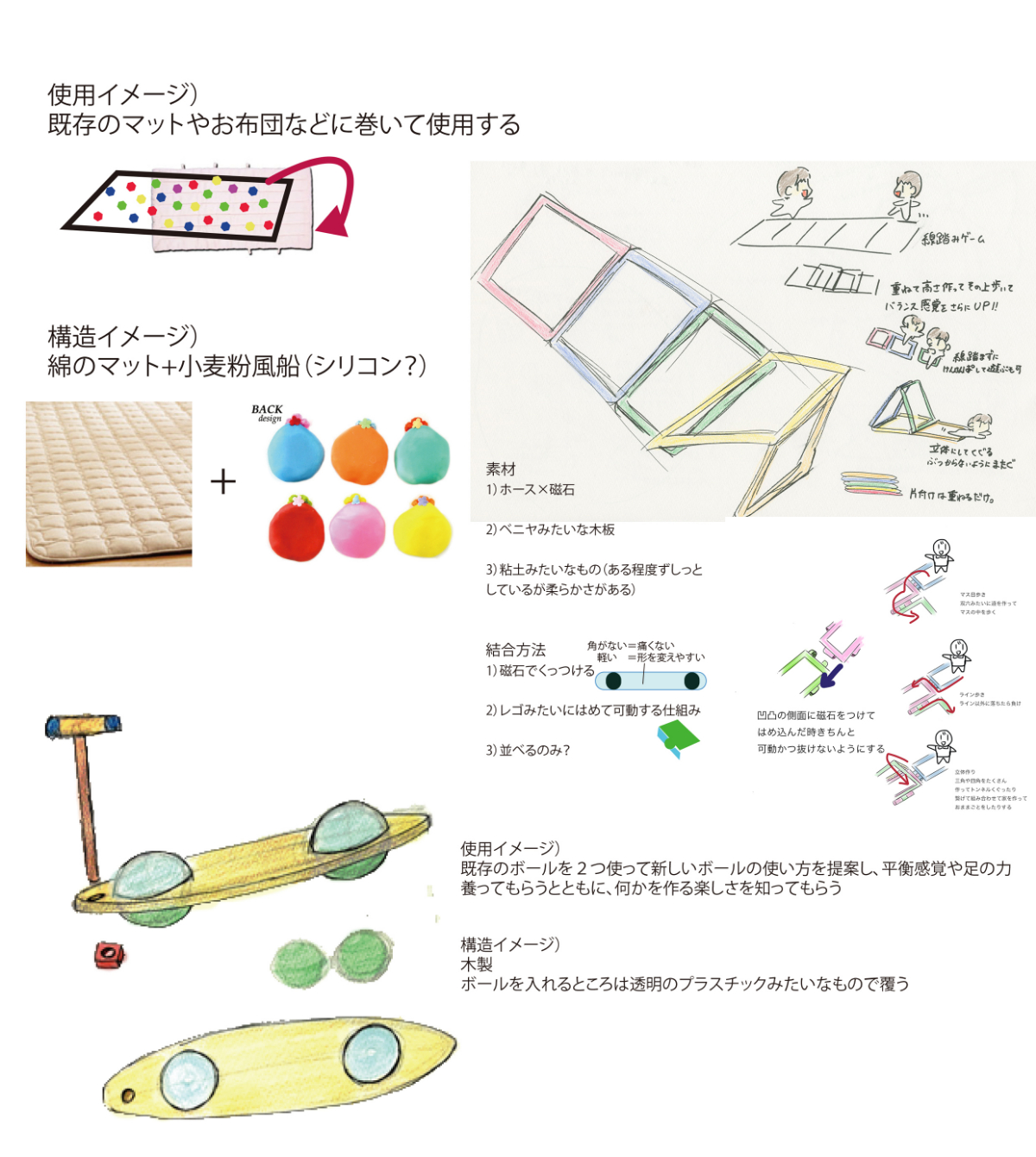 調査結果を受け、空間を絞らず、4,5歳の子どもたちが飽きずに楽しく遊べて平衡感覚をつけることのできる玩具と遊び方のアイデア展開を行ないました。