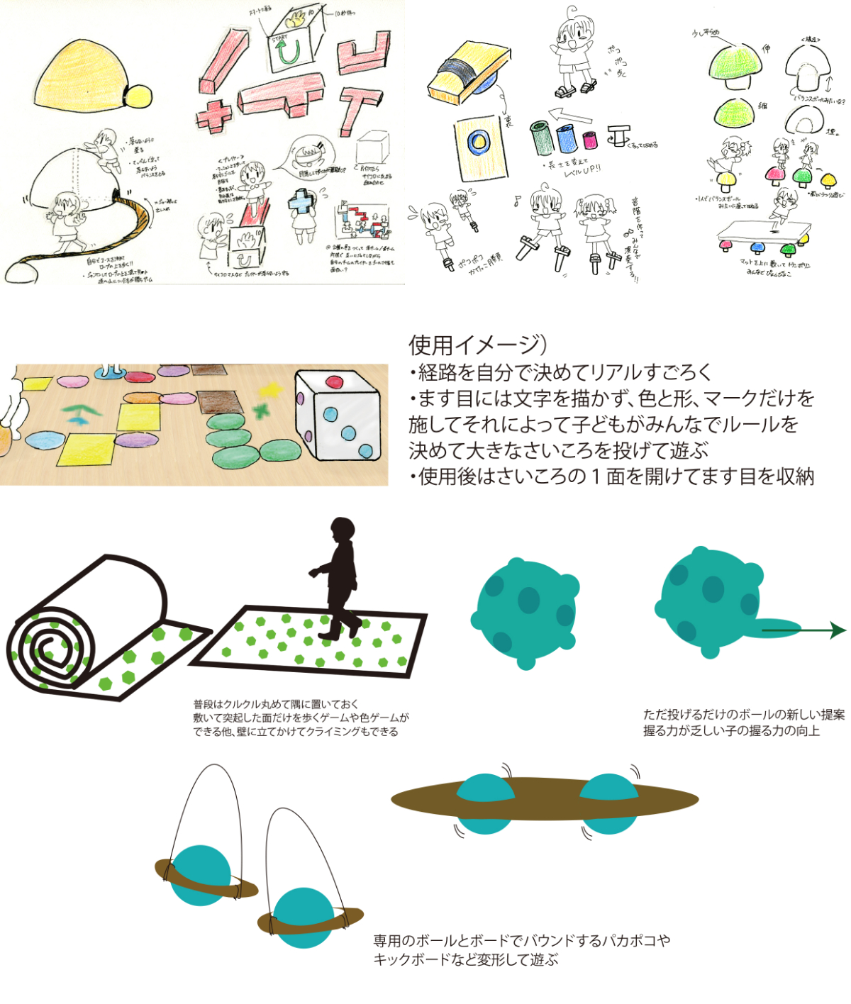 その中で、空間を幼稚園や保育園、児童館などの保育施設の屋内に設定し、子どもたちが自分で考えて簡単に組み立てたり、並べたりしたものの上を歩く・走るなどをして平衡感覚を自然に養うことのできる玩具のデザイン案に決定しました。