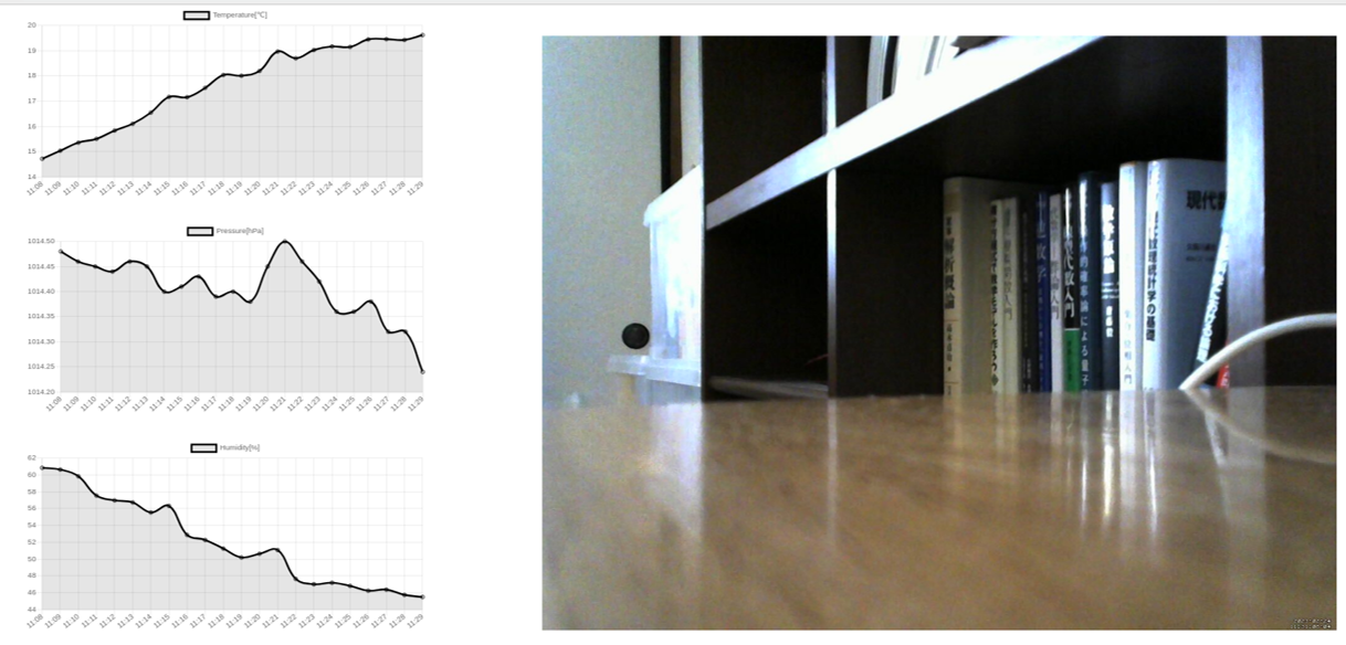 第24回テクノフェスタ in 浜松 での展示作品 Raspberry Piとセンサで気圧, 温湿度データを取得し, 約1分間隔でグラフにプロットする. おまけで, motionを用いた動体検知カメラも表示した.