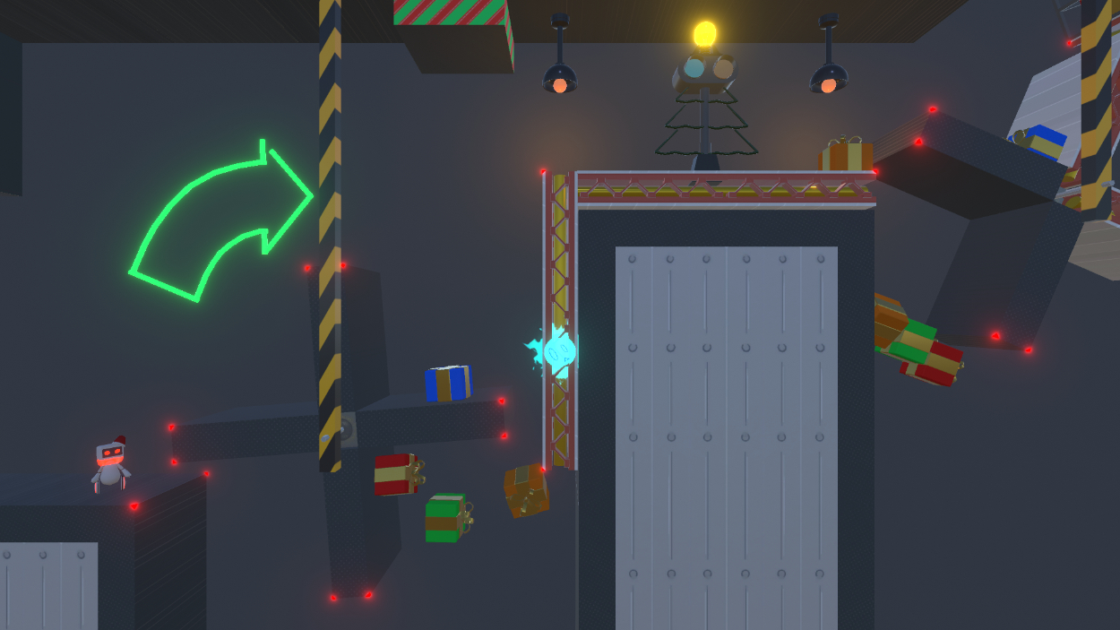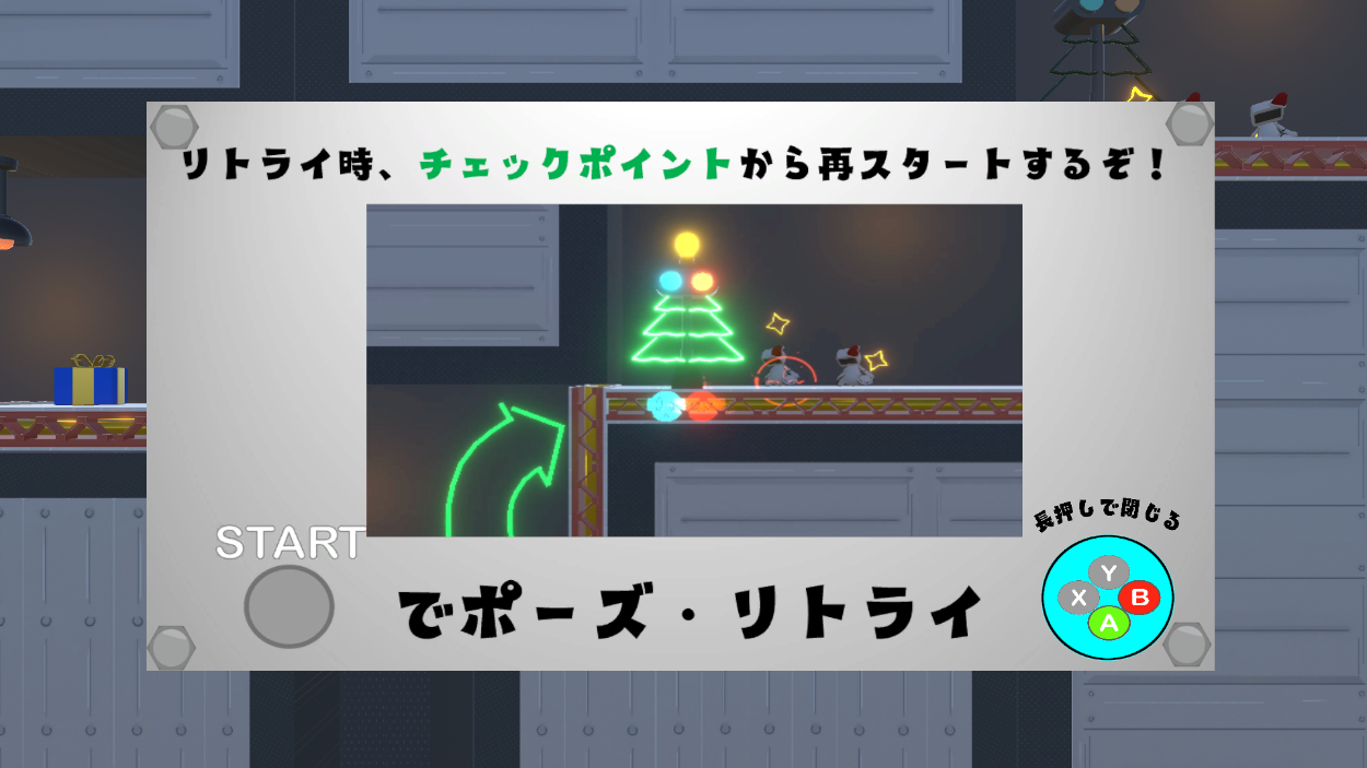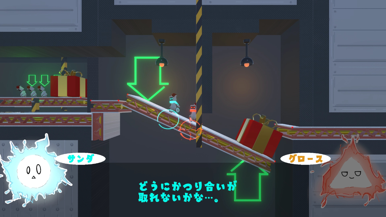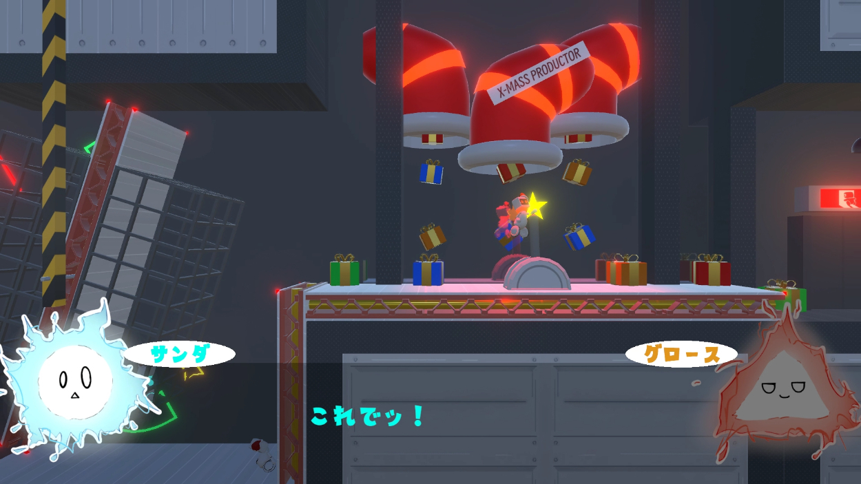 しかしプレゼントを作るマシンの電源を切るのを忘れてしまった!このままでは工場にプレゼントがあふれてクリスマス存続の危機!マシンの電源を切るために最奥にあるレバーを目指す。