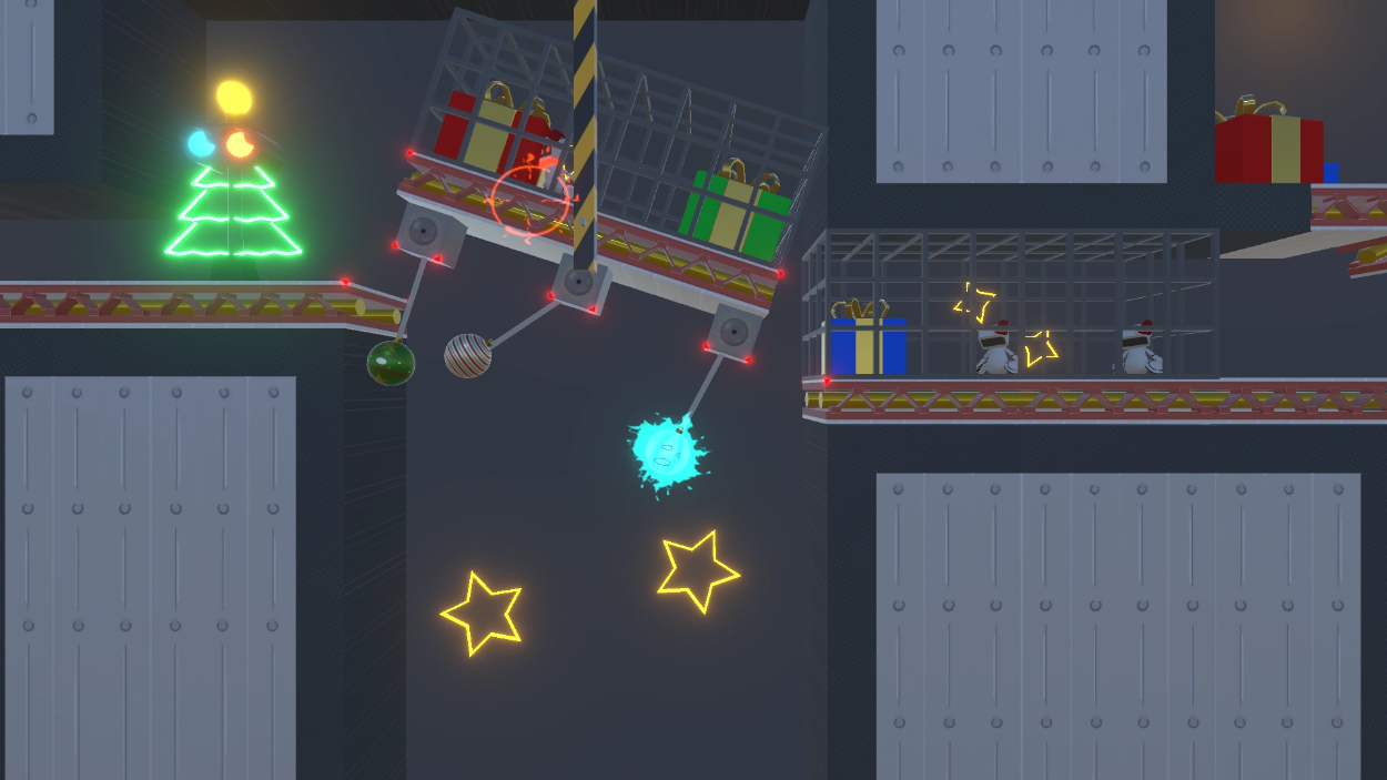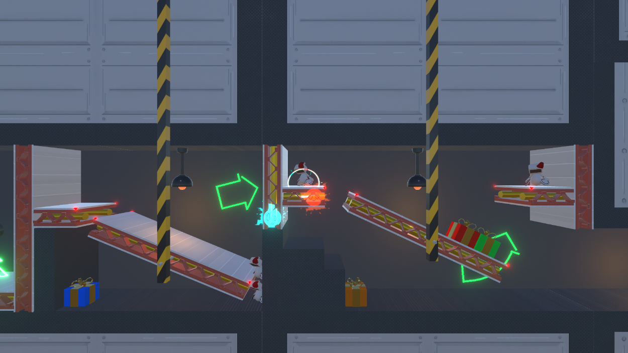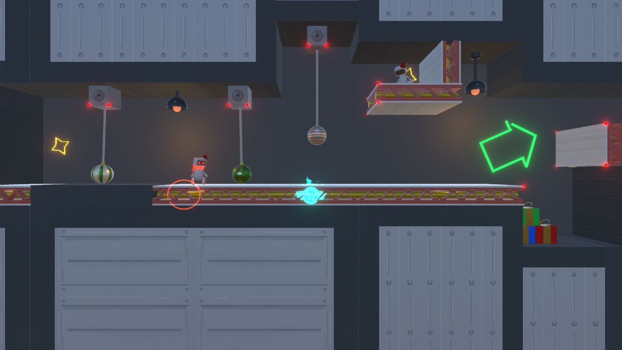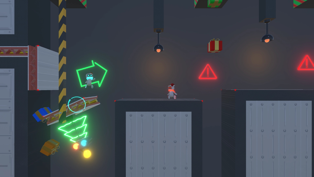 しかしプレゼントを作るマシンの電源を切るのを忘れてしまった!このままでは工場にプレゼントがあふれてクリスマス存続の危機!マシンの電源を切るために最奥にあるレバーを目指す。