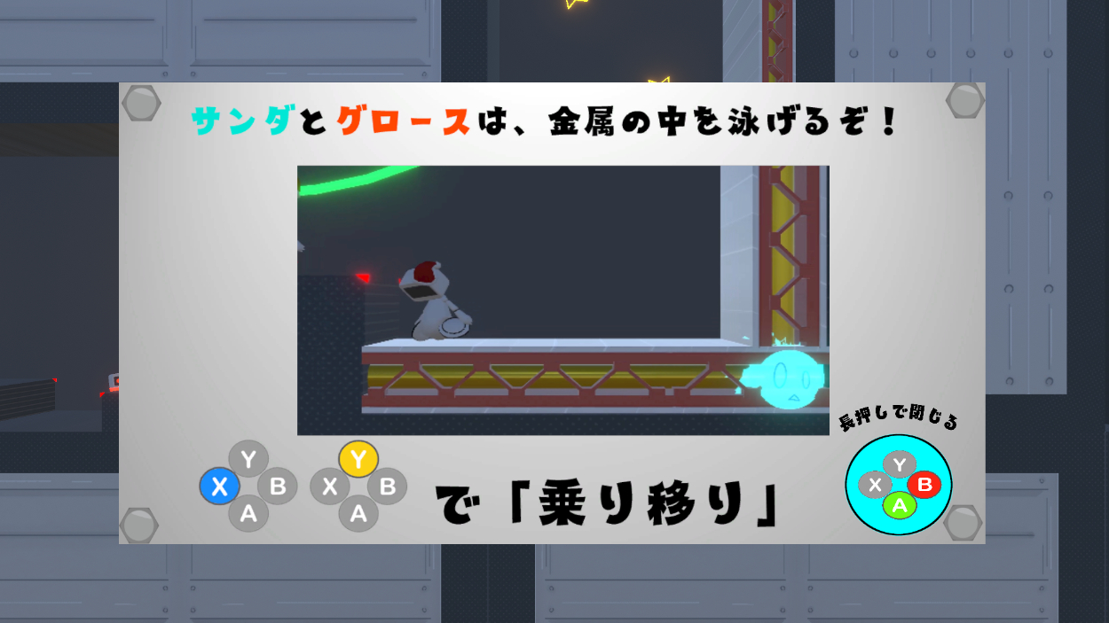 2人オフラインの協力パズルアクションゲームでコントローラで遊びます。左スティックで左右移動、AかBでジャンプします。PS4やPS5のコントローラでも遊べるのでこの場合は×と〇ボタンです。1Pが青のサンダ、2Pが赤のグロースになります。
