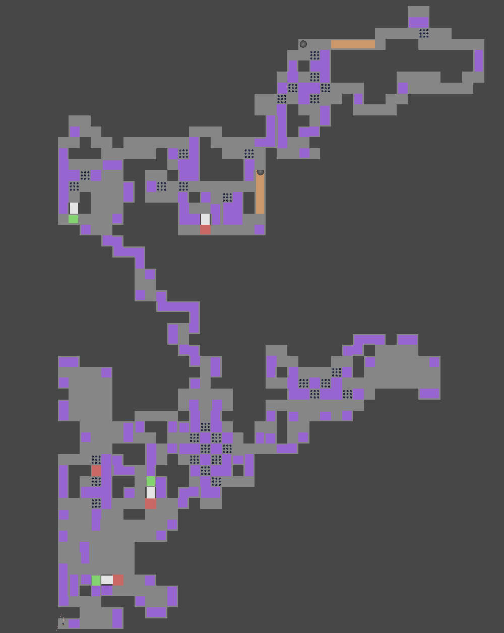 マップの生成は0,0,0のポイントから始まり、そこからグリッド全体にランダムに広がります。アルゴリズムは、まず0,0,0の周りのポイントをチェックし、それらのポイントが空いている場合、マップの一部を作成します。アルゴリズムが行き詰まり、最後のマップ部分の周りに利用可能なポイントがなくなると、階段を作成してマップの生成を続けます。再びアルゴリズムが行き詰まると、階段を作成して下の階に移動し、これを繰り返します。アルゴリズムは、最低限のプラットフォーム数に達するまで、マップの生成を繰り返します。