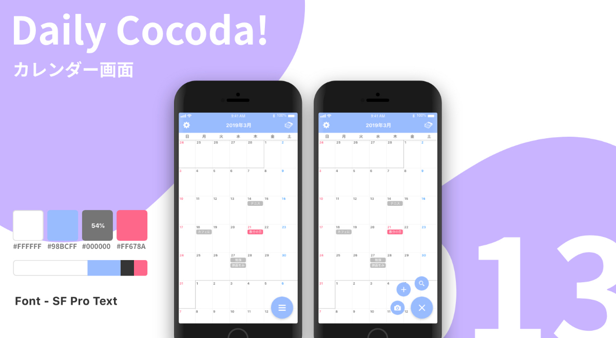 月、週、日の表示切り替えはひとまず不要と考え削除し、予定はカレンダーの日付部分をタップして追加できる想定です。