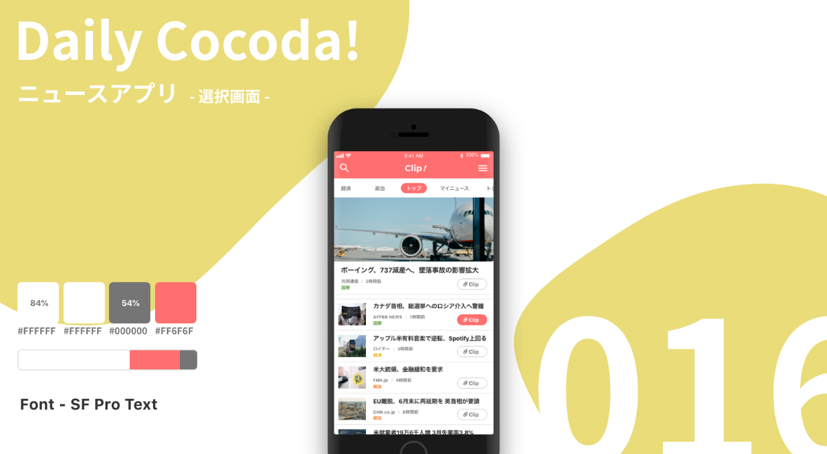 気になる記事をストックできるように各記事にクリップボタンを設置しました。画面下部のタブバーは表示せず設定や検索などの機能に関しては画面上部にボタンを設置し、ニュース記事部分を多く表示させました。