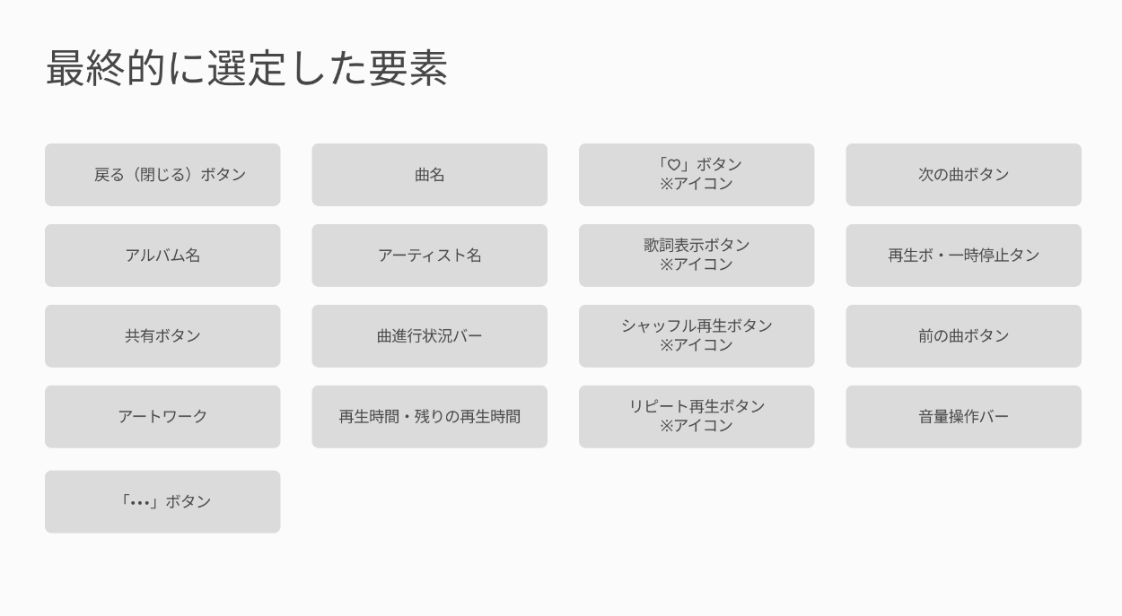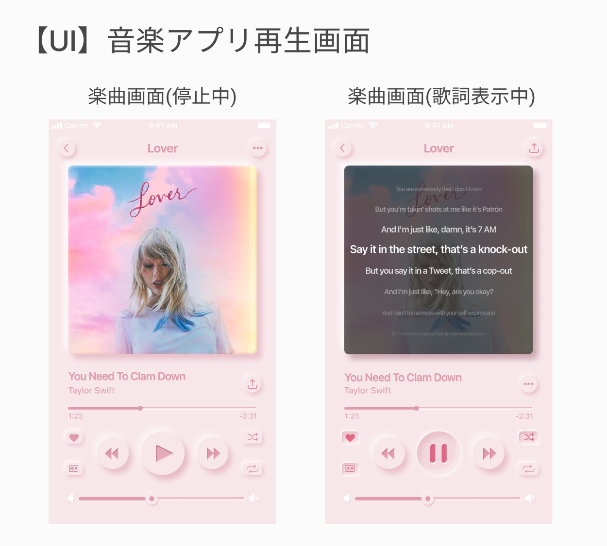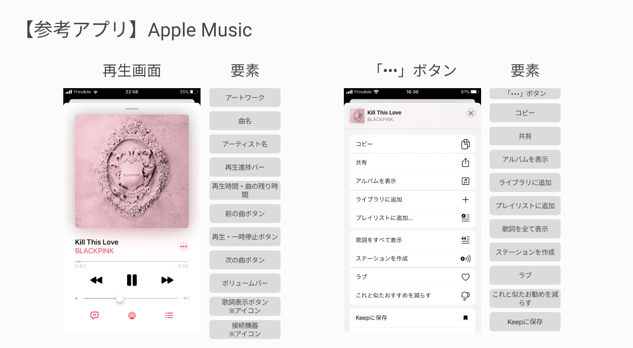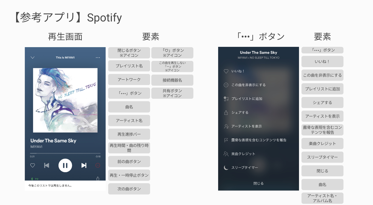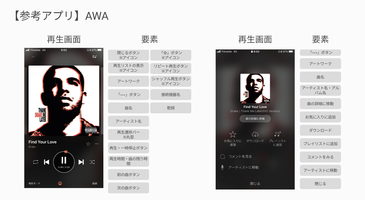 ・画面の要件を決めるために、主要な音楽アプリの再生画面から要素を抽出し、UI画面を作成しました。(参考アプリ:Apple Music / Spotify / AWA)