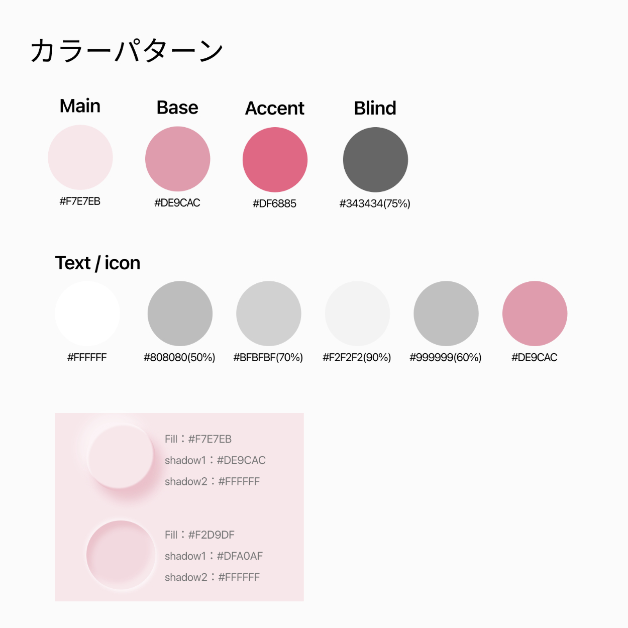 ”おしゃれに気を使う20代女性” が使う音楽アプリを意識し、淡いピンクの可愛らしさ+ニューモーフィズムのスタイリッシュさを合わせて作成しました。