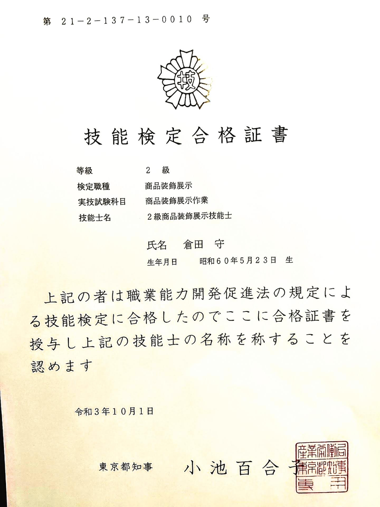・これまでの私のリアル店舗に於ける実務経験をいくら述べても、皆様が実際に「リテールクリニックコンサルティング」に仕事を依頼される動機づけに繋がる安心材料が弱いと思います。少しでも安心、納得してお仕事をご依頼して頂きたいので、実務経験だけでなく、カタチとして一目で認知頂ける「国家資格 2級商品装飾展示技能士」と「商空間スタイリスト」の資格を取得しております。