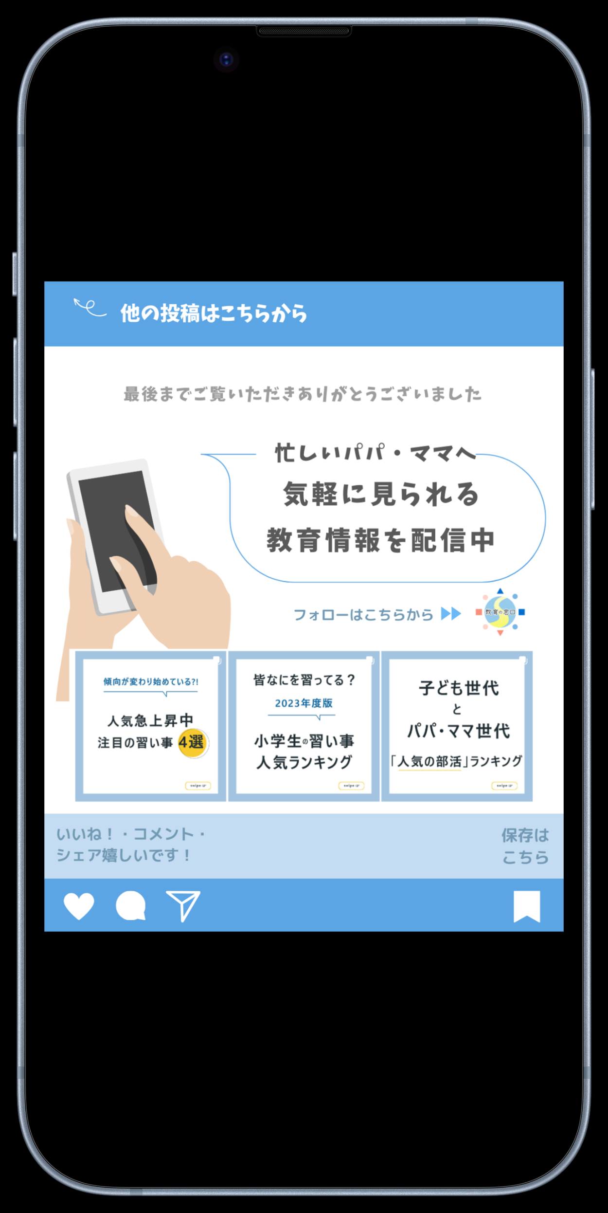 【工夫した点】パパママ達に「教育情報を気軽に見にきてもらう」というコンセプトで運営しているアカウントだったので、身近な話題を見やすい形でまとめるように心がけました。