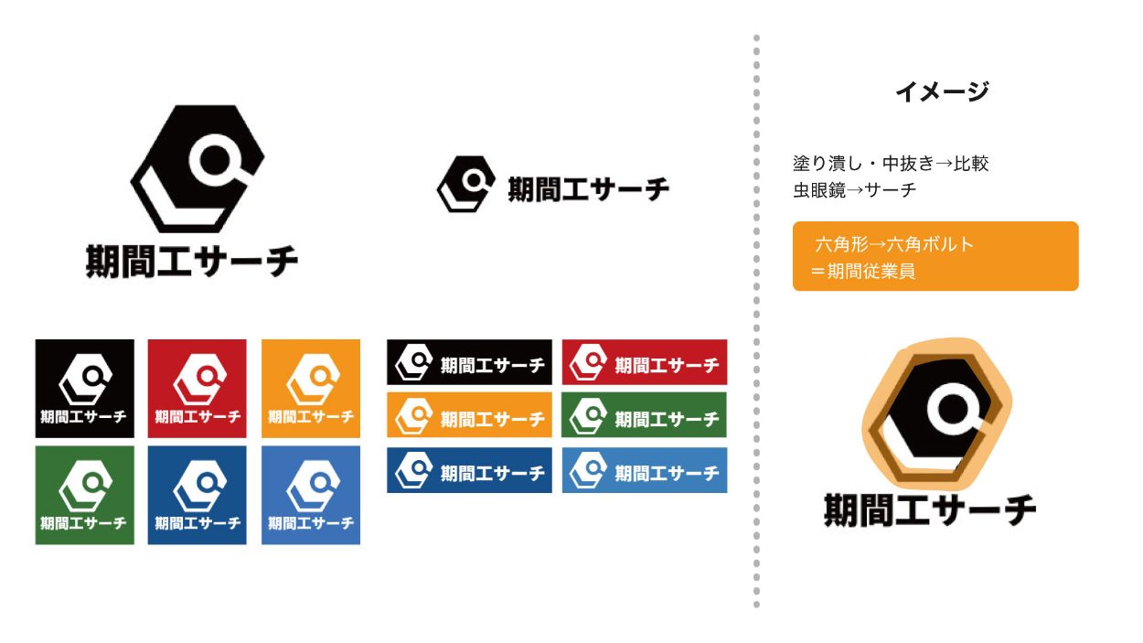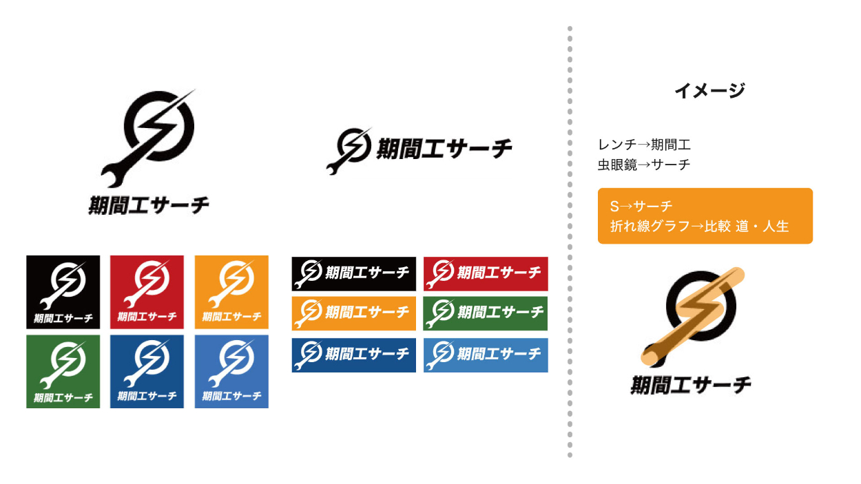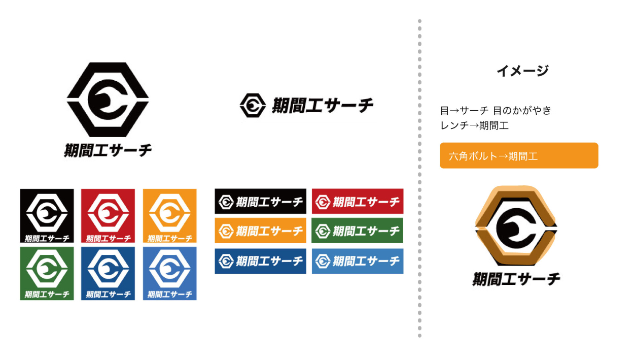 その結果、"求人サーチということが分かりやすく、製造メーカーを連想させる工具がある”という当初のコンセプトとマッチし、躍動感があり活動的なイメージと一致するという事で、上記画像1つめの案でいくことになりました。