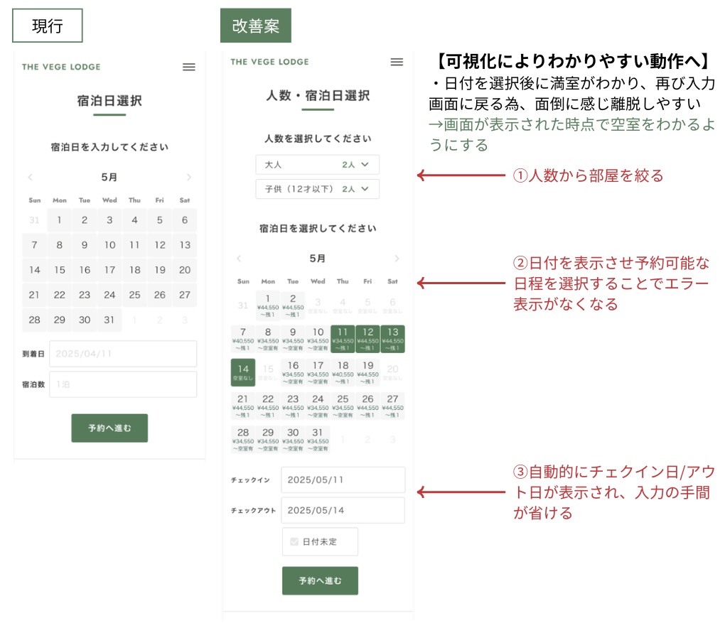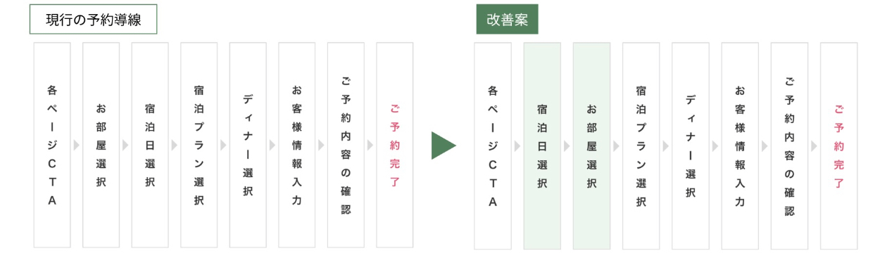 ・宿泊日の選択を最初に行い、空室を確認後に全てを選択していく流れへと変更