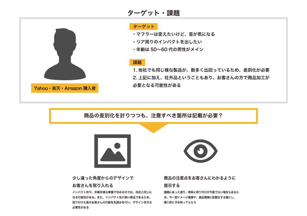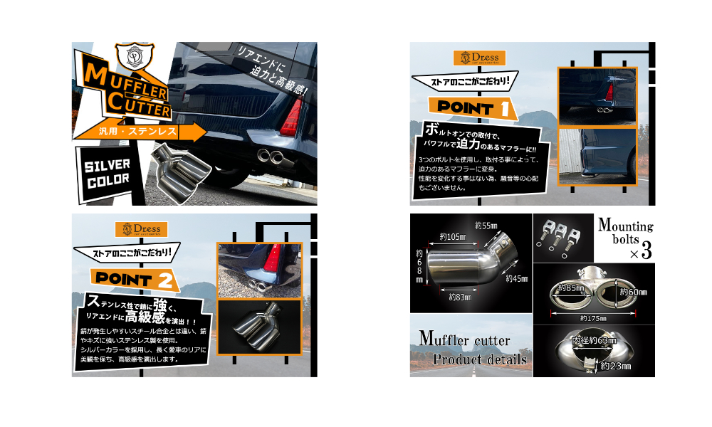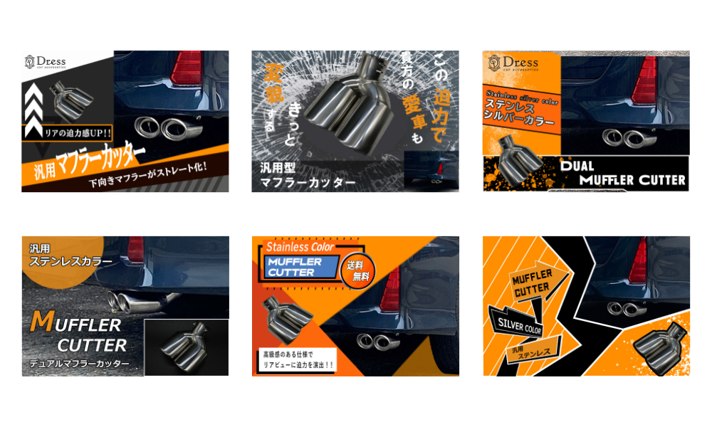 Dressの商品の中から、他社とは違う商品ページを1つ作って欲しいとの依頼を受け、ストアの販売実績と、カーパーツの中でもマフラー(排気管)に取付る商品である「マフラーカッター」にフォーカスし、バナー作成を取り組みました。