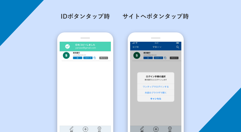 ID・パスワードボタン、サイトへボタン : ID・パスワードボタンをタップするとその情報がコピーされ、サイトへボタンをタップすると直接サイトへ移動することができる。