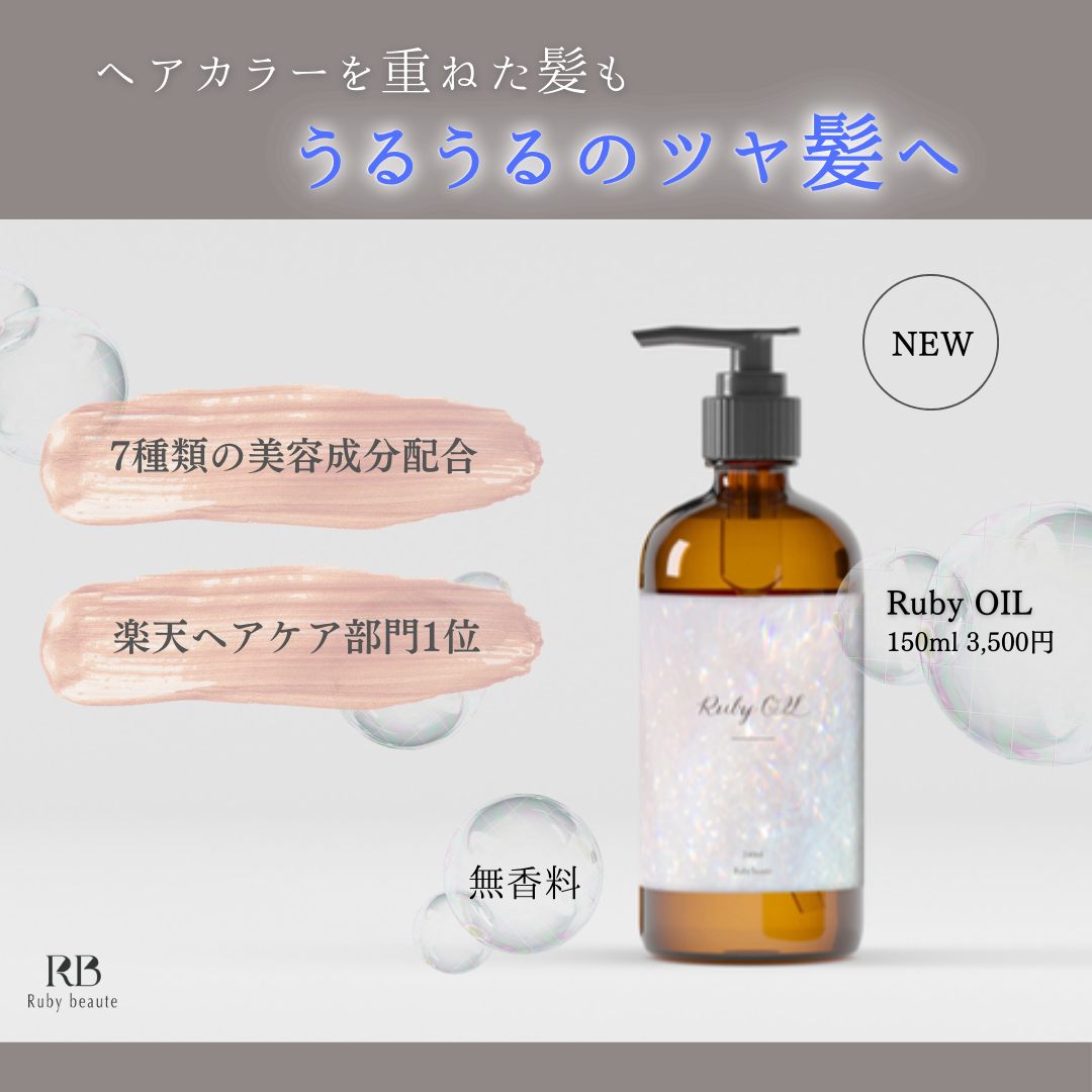 商品情報:Ruby OILはヘアカラーを楽しむ方のお悩みに寄り添ったヘアオイルとして開発されました。ヘアカラーで傷んだ髪のパサつきを、潤いのある滑らかなツヤ髪へ導きます。保湿美容成分を7種類配合しており、傷みのケアはもちろん、カラーの色持ちも良くしてくれます。普段の生活やリラックスタイムにも気にならない無香料。